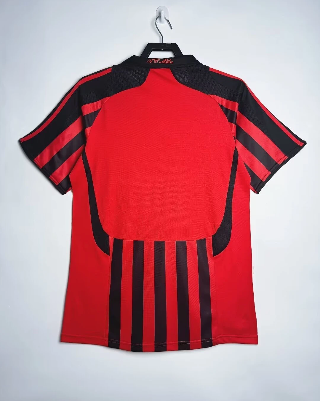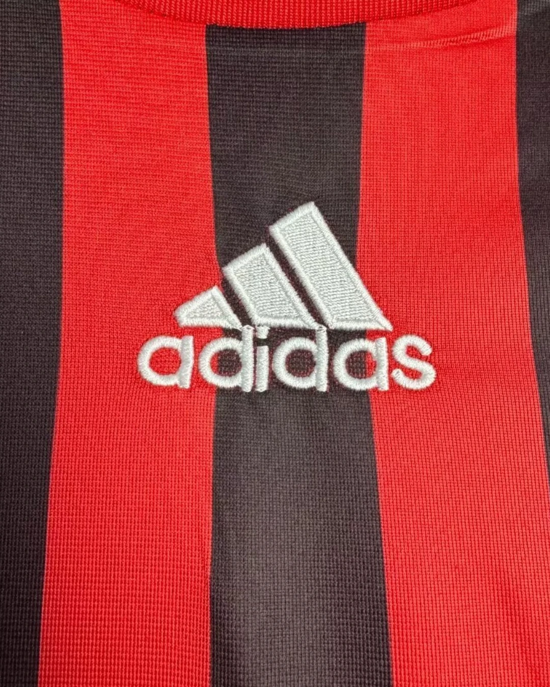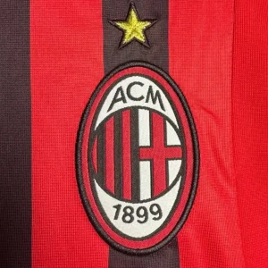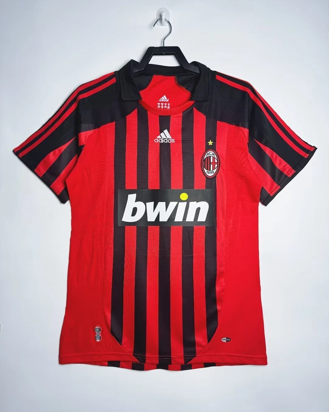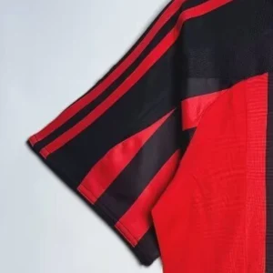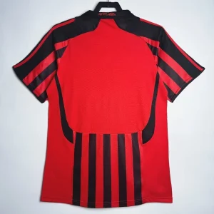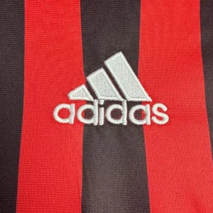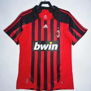 AC Milan’s 2007/08 Home Jersey from Adidas powered Carlo Ancelotti’s Rossoneri to Champions League and Club World Cup triumphs despite a transitional Serie A season at San Siro. The classic design features traditional red-and-black vertical stripes with black shoulders and upper chest, elegant crew neck fold-over collar, three red Adidas stripes on shoulders, embroidered club crest with gold scudetto star on left chest, prominent white “bwin” sponsor across the black band, and ClimaCool ventilation, sophisticated kit blending timeless heritage with modern performance.