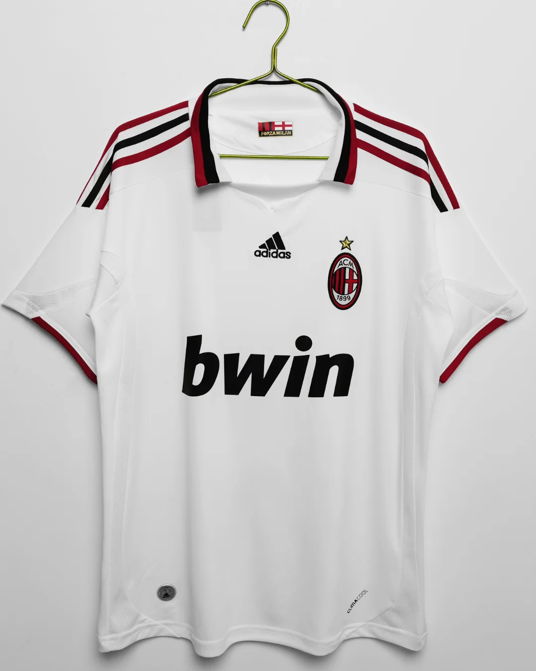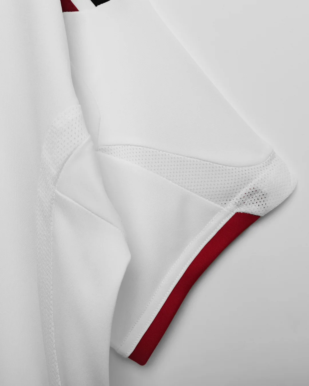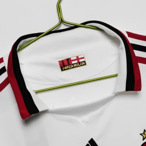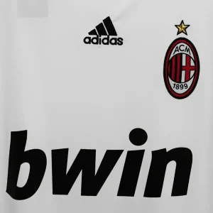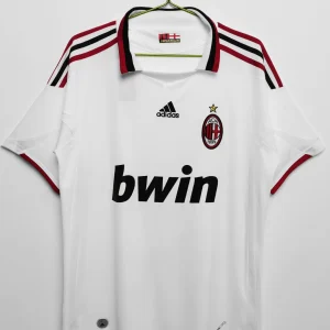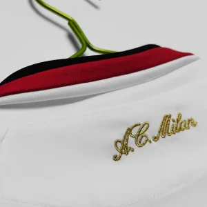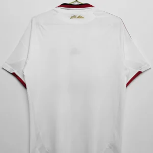 Step into the elegance of Italian football with the AC Milan 2009/10 Away Jersey, a stylish departure from the club’s iconic red and black home colors. Manufactured by Adidas, this away kit features a clean white base accentuated with subtle black and red stripes on the shoulders, collars and cuffs representing AC Milan’s rich heritage with modern design sophistication.