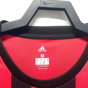 AC Milan’s 2017/18 Home Jersey from Adidas celebrated the Rossoneri’s resurgence under Gennaro Gattuso, powering a 6th-place Serie A finish and Europa League qualification at San Siro with stars like Gianluigi Donnarumma, Leonardo Bonucci, Suso, Patrick Cutrone, and Hakan Çalhanoğlu. The iconic red-and-black vertical stripes draw direct inspiration from the club’s dominant 1987-97 era, featuring ribbed black crewneck collar with Italian flag accents, black ribbed cuffs, mesh side inserts for ventilation, red Adidas 3-Stripes on shoulders, woven club crest with updated badge on left chest, and Emirates sponsor across the center, modern homage to Milan’s golden heritage.