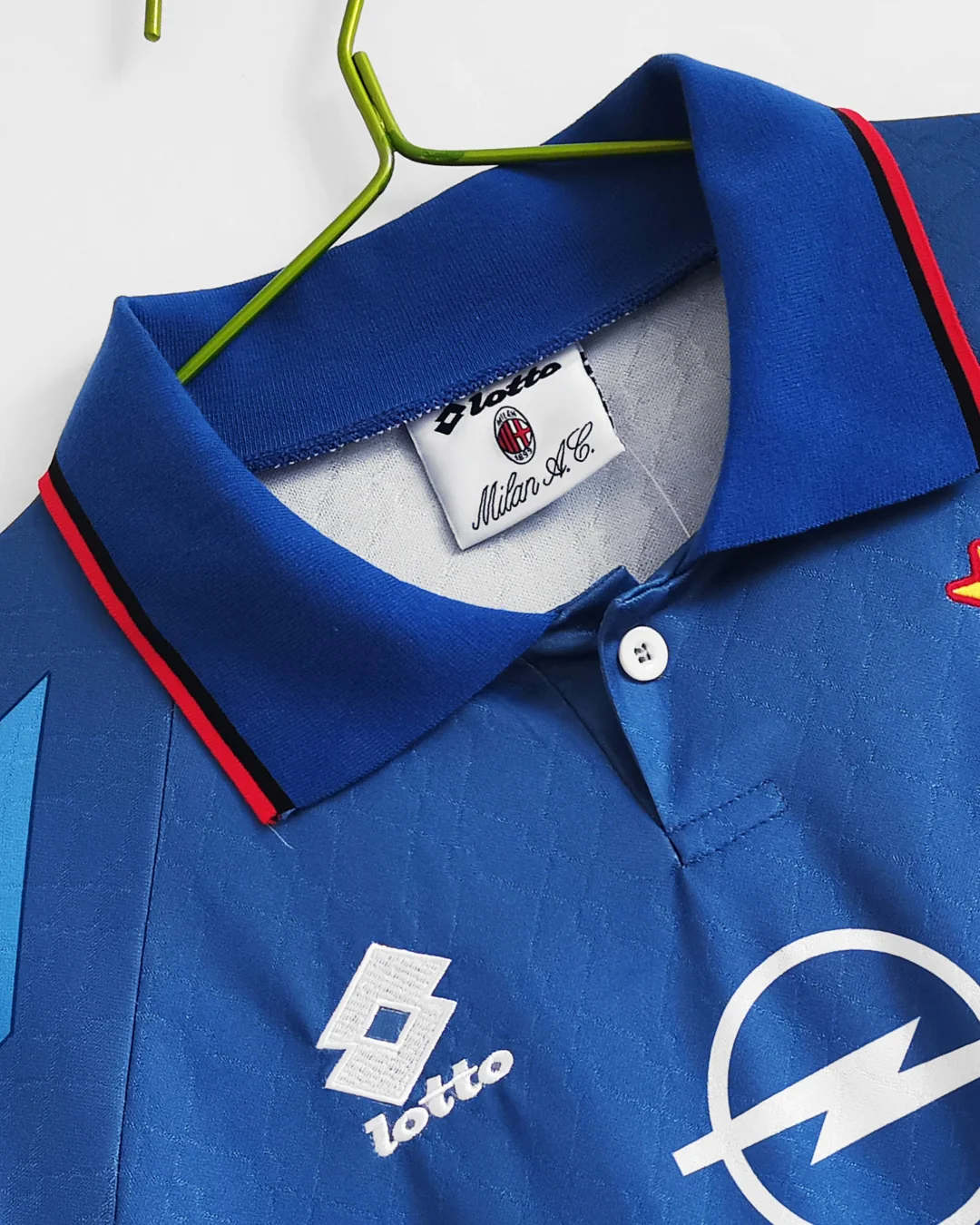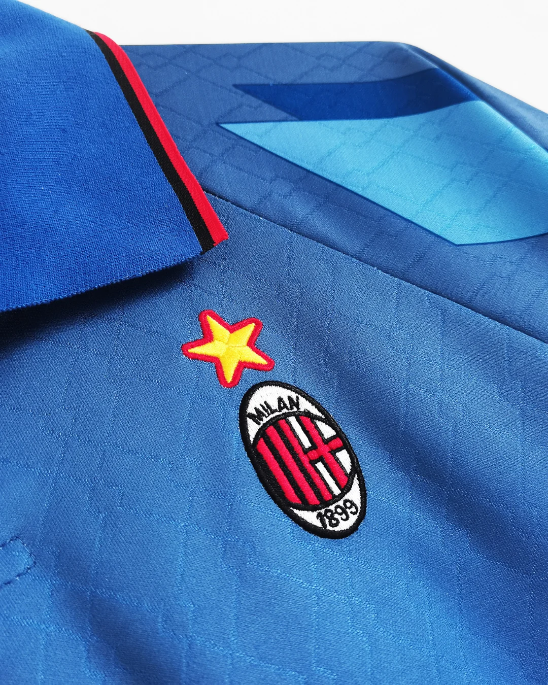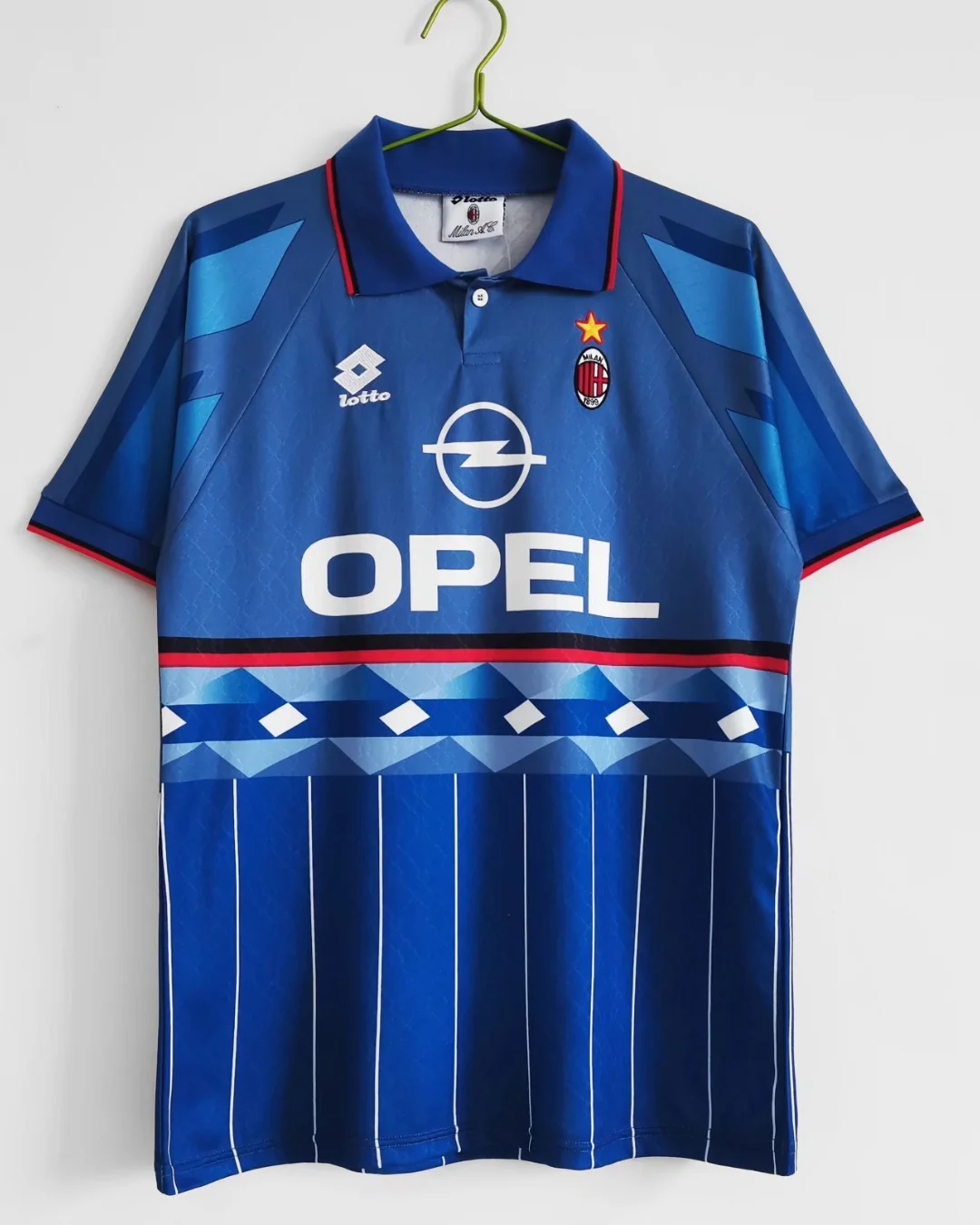 Experience the unique charm of AC Milanβs 1995/96 Fourth Jersey, famously known as the βhidden jersey,β a striking and innovative addition to the Rossoneriβs legendary kit collection. Worn during pre-season friendlies and remembered fondly by fans, this jersey captures the adventurous spirit and cutting-edge style of mid-90s football.Β Featuring a vibrant blue base with geometric patterns in azure tones across the front, back, and sleeves, the jersey is accented with a horizontal red and black stripe on the front, symbolizing the clubβs iconic colors in a fresh way.