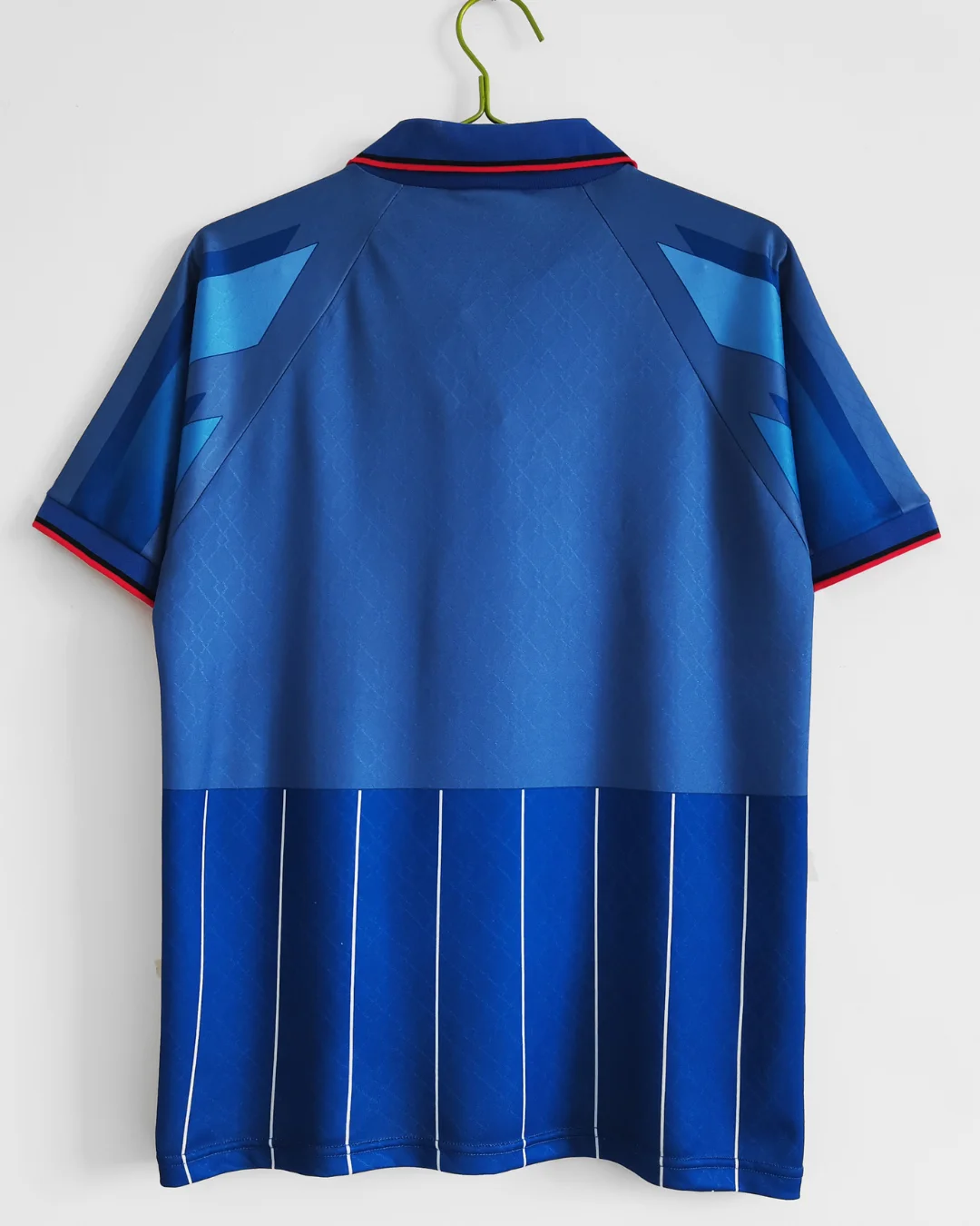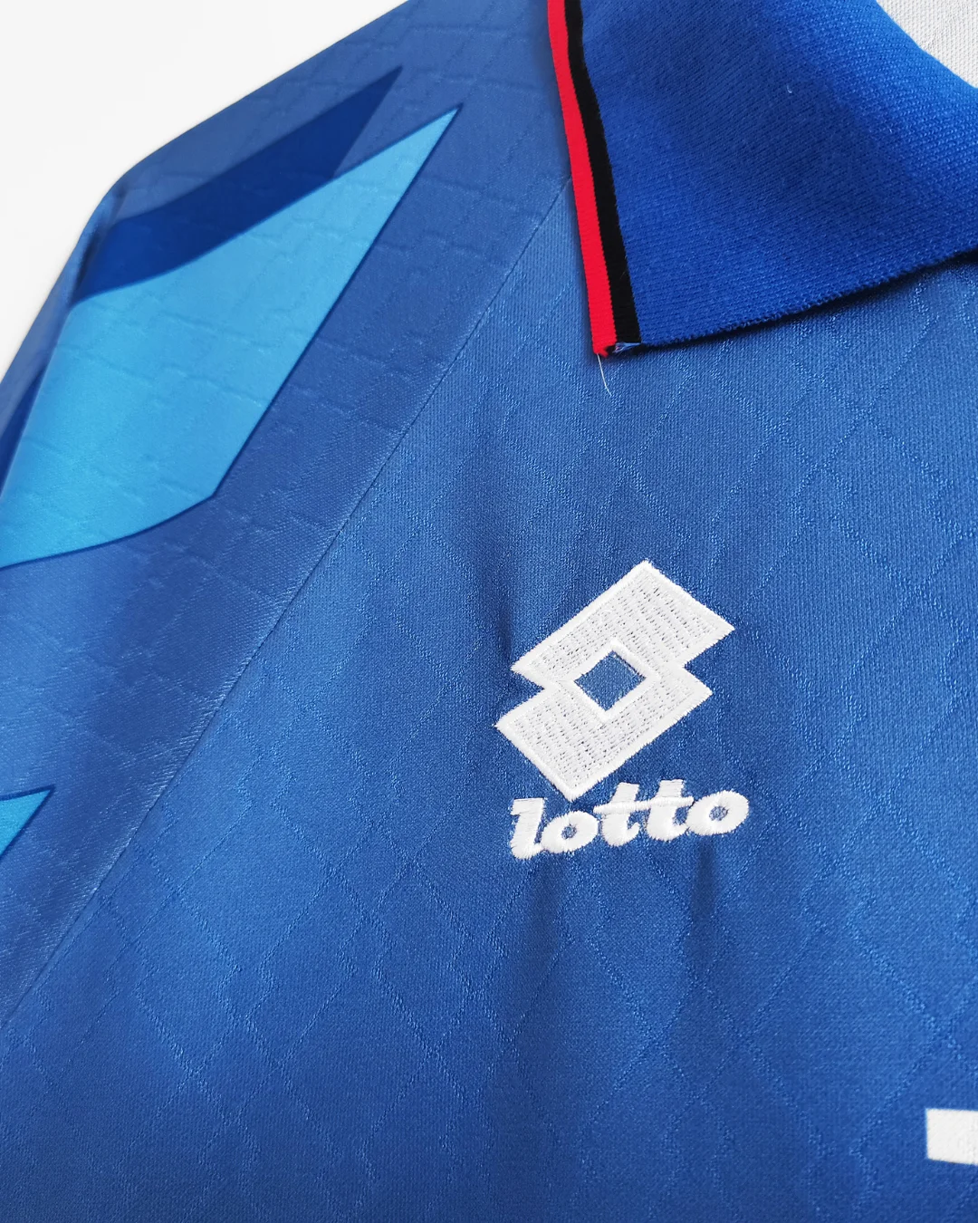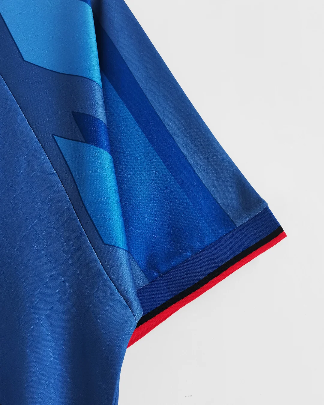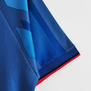 Experience the unique charm of AC Milanβs 1995/96 Fourth Jersey, famously known as the βhidden jersey,β a striking and innovative addition to the Rossoneriβs legendary kit collection. Worn during pre-season friendlies and remembered fondly by fans, this jersey captures the adventurous spirit and cutting-edge style of mid-90s football.Β Featuring a vibrant blue base with geometric patterns in azure tones across the front, back, and sleeves, the jersey is accented with a horizontal red and black stripe on the front, symbolizing the clubβs iconic colors in a fresh way.
