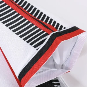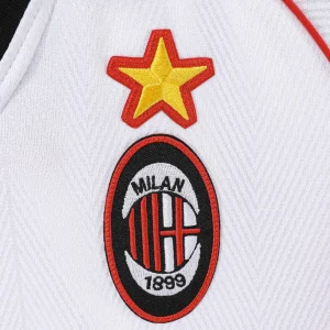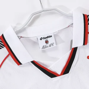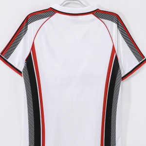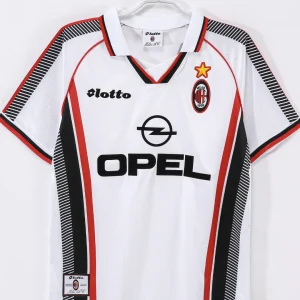 Step back into a defining era of AC Milan’s illustrious history with the 1997/98 Away Jersey, a striking and memorable kit worn during the season when Fabio Capello returned to guide the Rossoneri. This jersey features a clean, pure white base accented by bold vertical black and red stripes flowing dynamically down the torso and sleeves, symbolizing the club’s fierce identity.