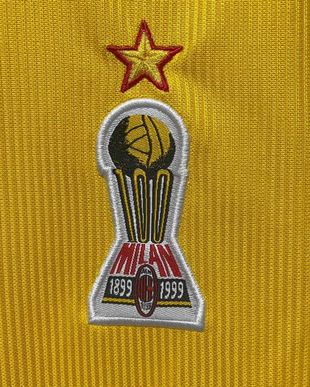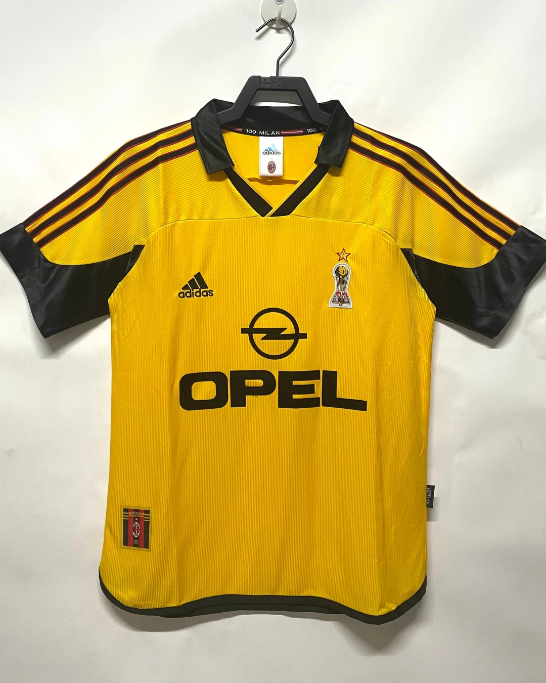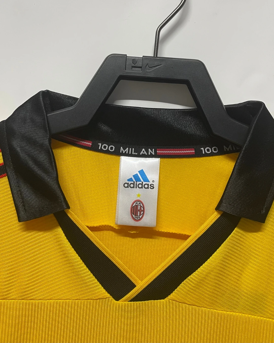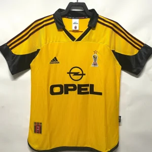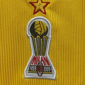 AC Milan’s ultra-rare 1999/00 Fourth Jersey from Adidas celebrated the club’s centenary (1899-1999), debuting at San Siro’s festive centenary event alongside Andriy Shevchenko’s unveiling, then appearing only in preseason friendlies against Bayer Leverkusen and Real Sociedad, never worn in competitive Serie A, Champions League, or Coppa Italia matches during Alberto Zaccheroni’s Scudetto-contending season. The striking yellow design features black inserts and detailing, raised embossed sponsor, stitched club crest, ClimaLite ventilation underarms, and late-90s Adidas woven patterning with collar inscribed “100 Milion”, bold collector’s piece embodying Milan’s glorious past without seeing official action.