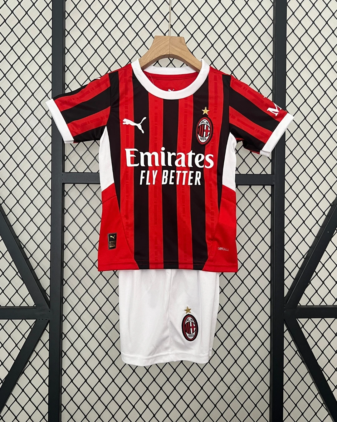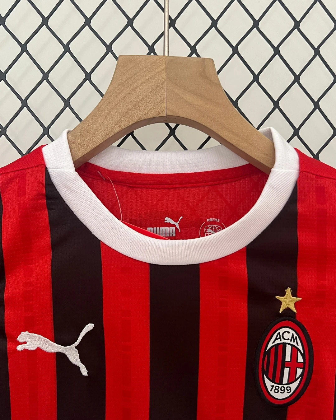 AC Milan’s 2024/25 Kids Home Jersey from Puma celebrates the Rossoneri’s 125th anniversary through evolved red-and-black stripes inspired by human genome graphics, symbolizing generational passion passed from 1899 to global fans, powering Serie A and Champions League pursuits at San Siro. Perfect for young Milanisti, this kit features moisture-wicking dryCELL technology, breathable mesh panels in high-heat zones, embroidered club crest with star on left chest, Puma logos on right chest and sleeves, 125th-anniversary neck detail, stretchable RE:FIBRE fabric from recycled textile waste, crew neck with white insert, short sleeves with ribbed cuffs, and regular kids fit.