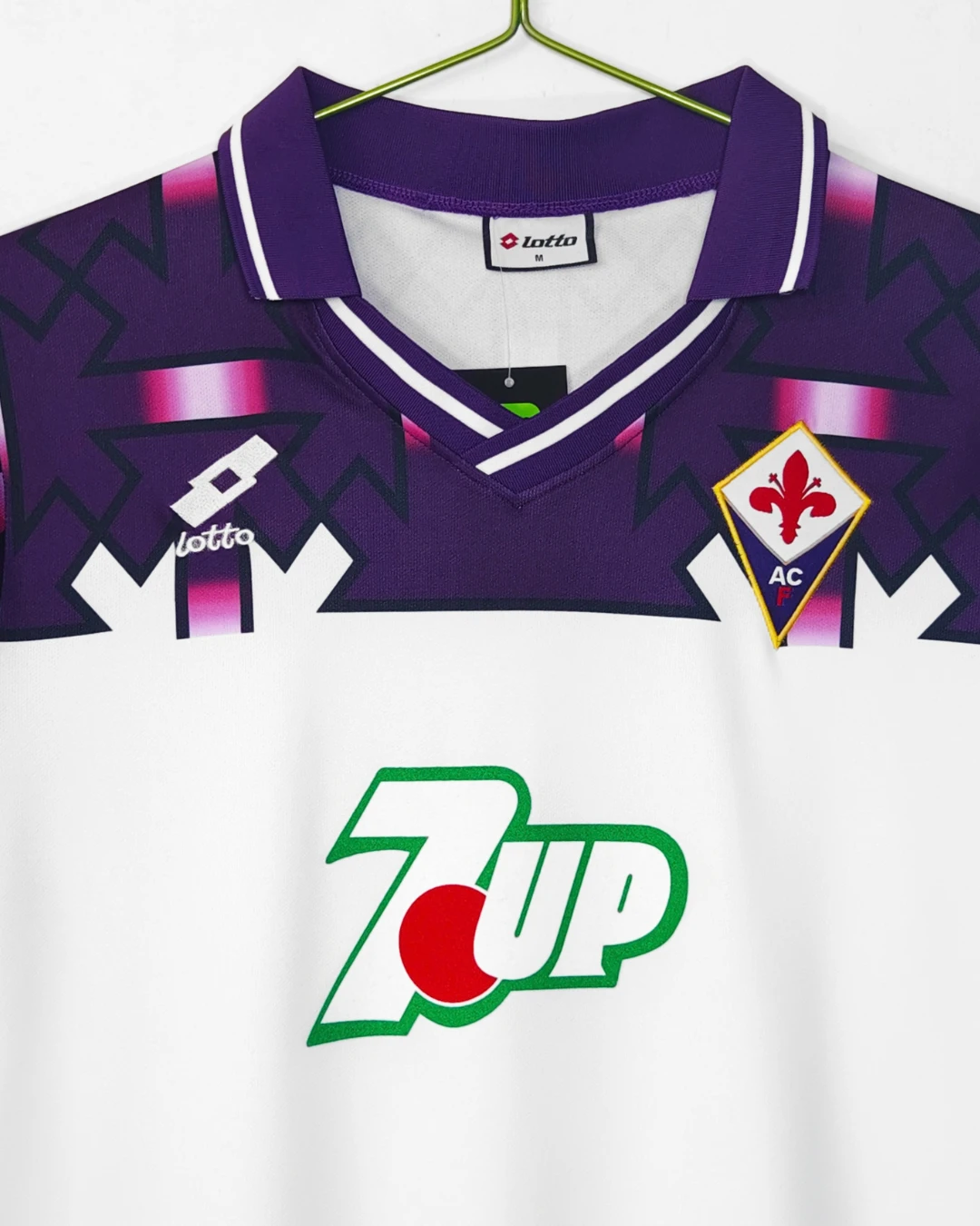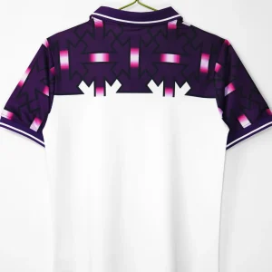 Fiorentina’s infamous 1992/93 Away Jersey from Lotto became one of football’s most controversial kits during their Serie A survival campaign, featuring a white base with bold geometric patterns on shoulders and sleeves that unintentionally resembled swastikas, iconic 7UP sponsor logo prominently displayed across the chest, clean V-neck fold-over collar design, worn before their shocking relegation from Italy’s top flight. Perfect for young Viola fans and collectors, this ultra-rare retro replica uses breathable 100% polyester construction replicating the original Lotto texture, embroidered lily crest on left chest, short sleeves and regular relaxed fit.
