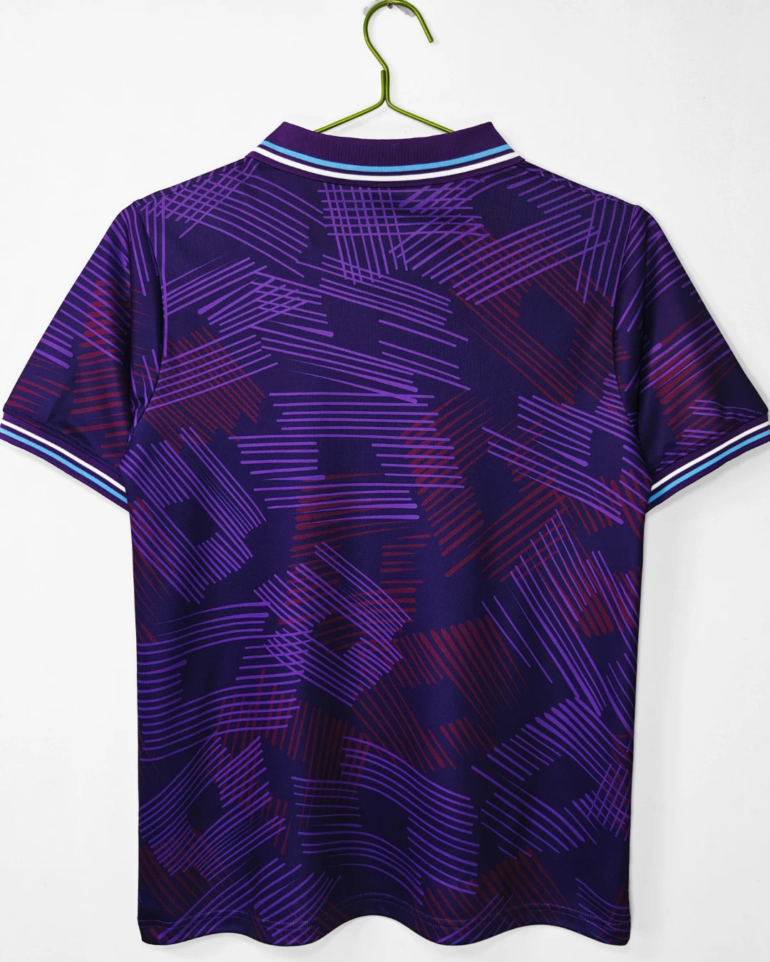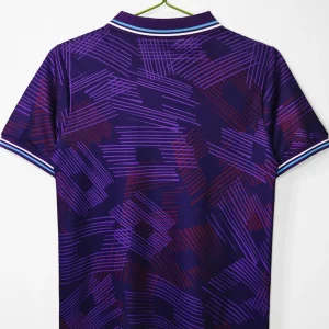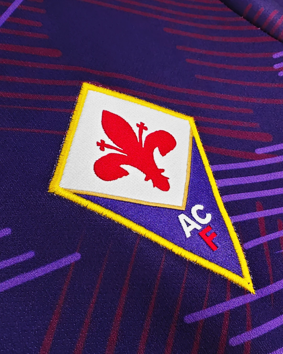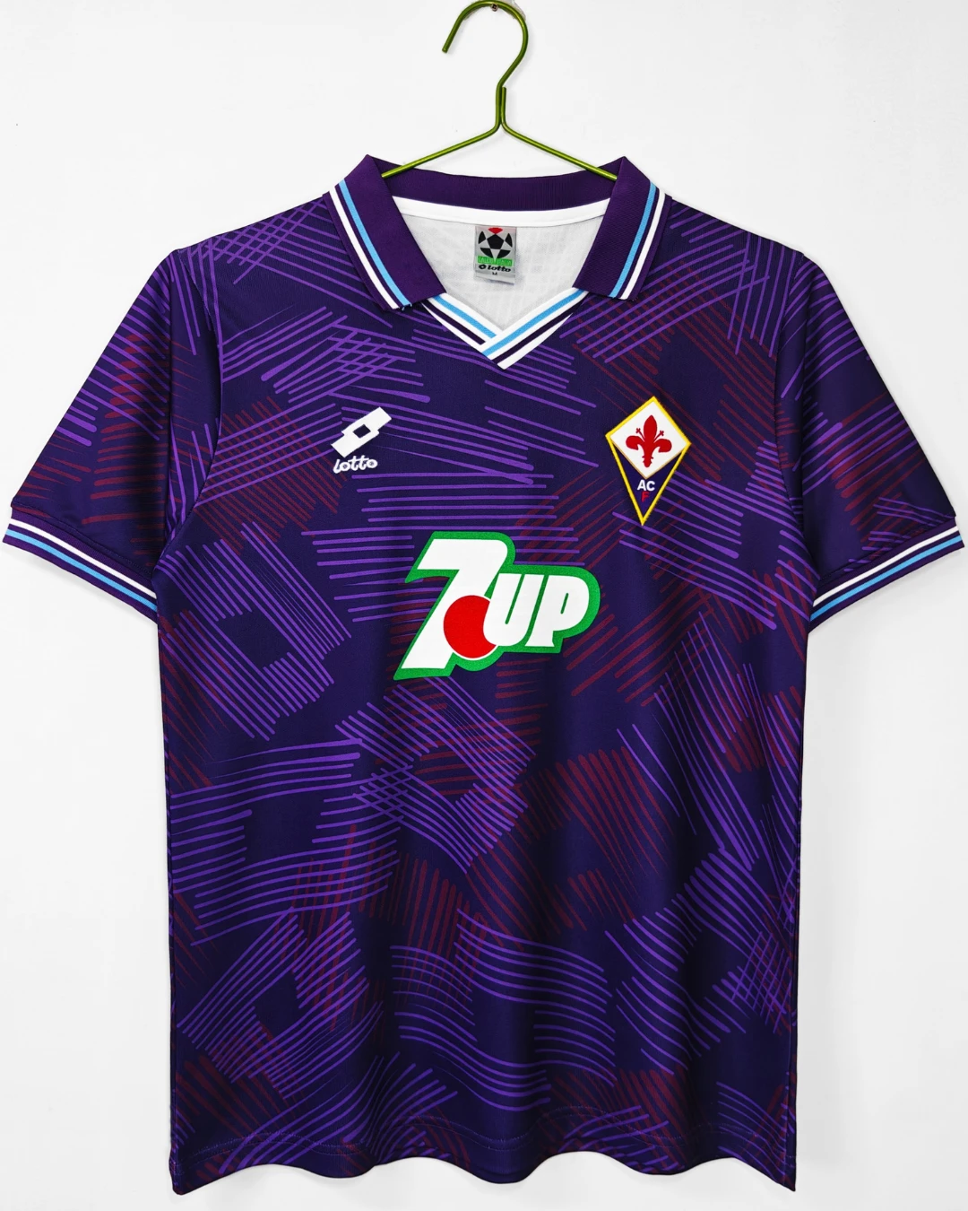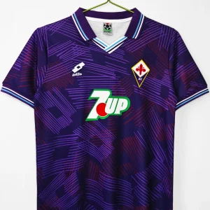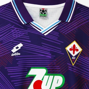 Fiorentina’s 1992/93 Home Jersey from Lotto marked their final Serie A season before shocking relegation, featuring the iconic vibrant purple “Viola” base with distinctive geometric shoulder patterns typical of early 90s design, revolutionary 7UP sponsor logo perfectly integrated across the chest, V-neck collar with white and sky blue trim details, worn during their dramatic survival campaign that ended in heartbreak on the final day. Perfect for young Viola supporters, this retro replica uses breathable 100% polyester construction replicating Lotto’s texture, embroidered lily crest on left chest, Lotto diamond logo in white, short sleeves and regular relaxed fit.