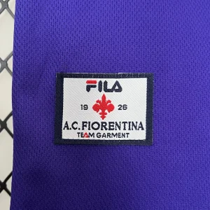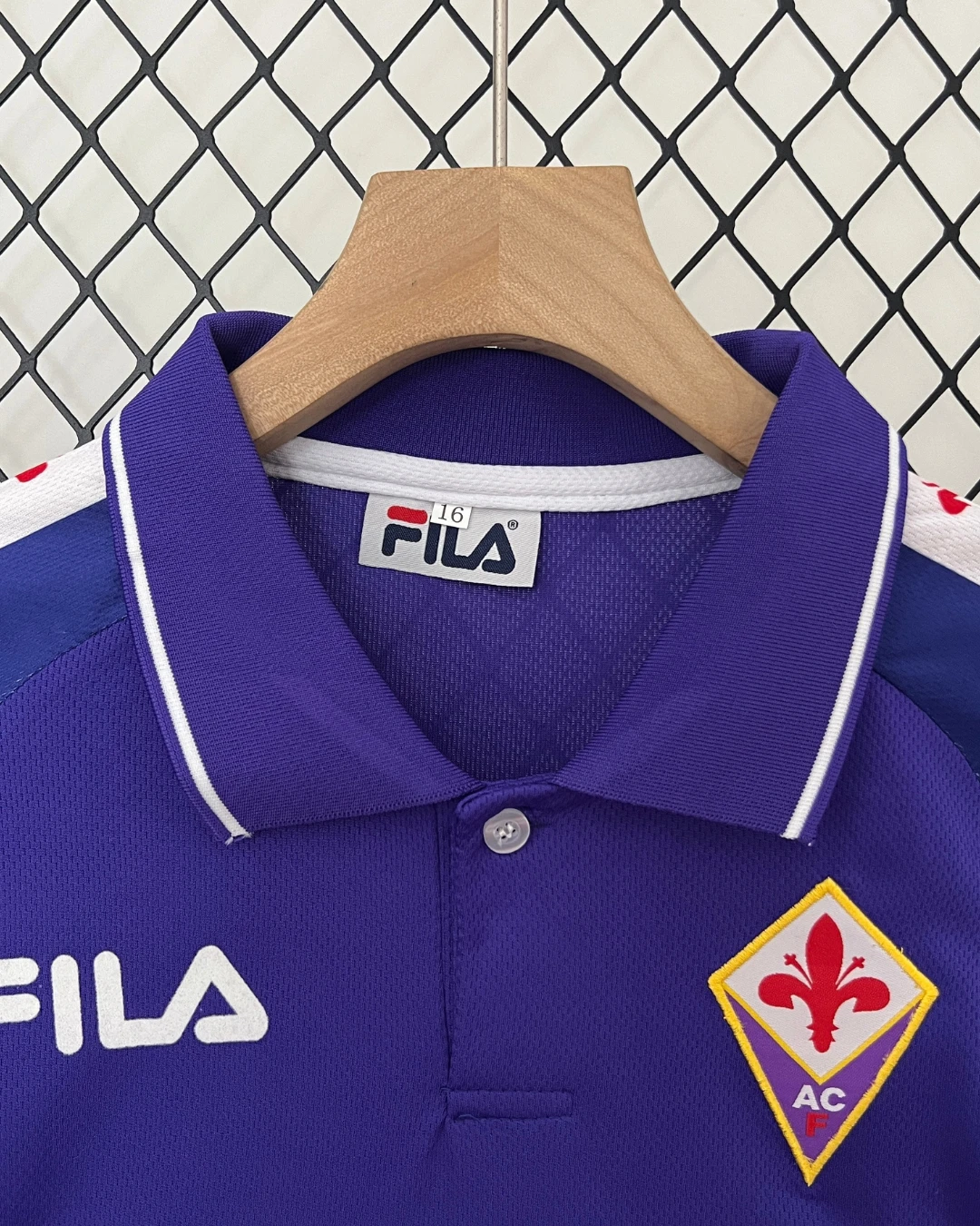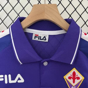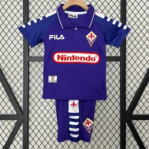 ACF Fiorentina’s 1998/99 Kids Home Jersey from Fila captures the Viola’s golden era under Giovanni Trapattoni, featuring iconic deep purple fabric with white shoulder stripes and elegant polo collar that powered Batistuta, Rui Costa, and Edmundo through their near-Scudetto Serie A campaign. Perfect for young tifosi, this retro replica showcases breathable lightweight polyester construction true to the original, embroidered classic Fiorentina lily crest on left chest, white Fila logo on right chest, bold red Nintendo sponsor across the front, button-down purple polo collar with white trim, short sleeves, slim but comfortable kids fit matching late-90s proportions.