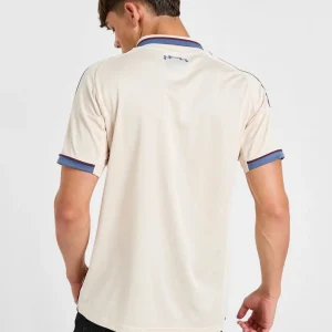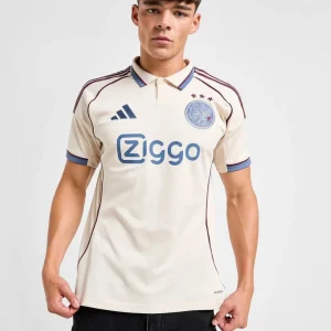 The AFC AJAX 25/26 THIRD STADIUM JERSEY by Adidas is a special edition kit paying homage to the rich 750-year history of Amsterdam. It is designed in a light beige color called Halo Ivory, complemented by maroon and navy detailing for the logos and trims, reflecting the classic and elegant style associated with the club and city.