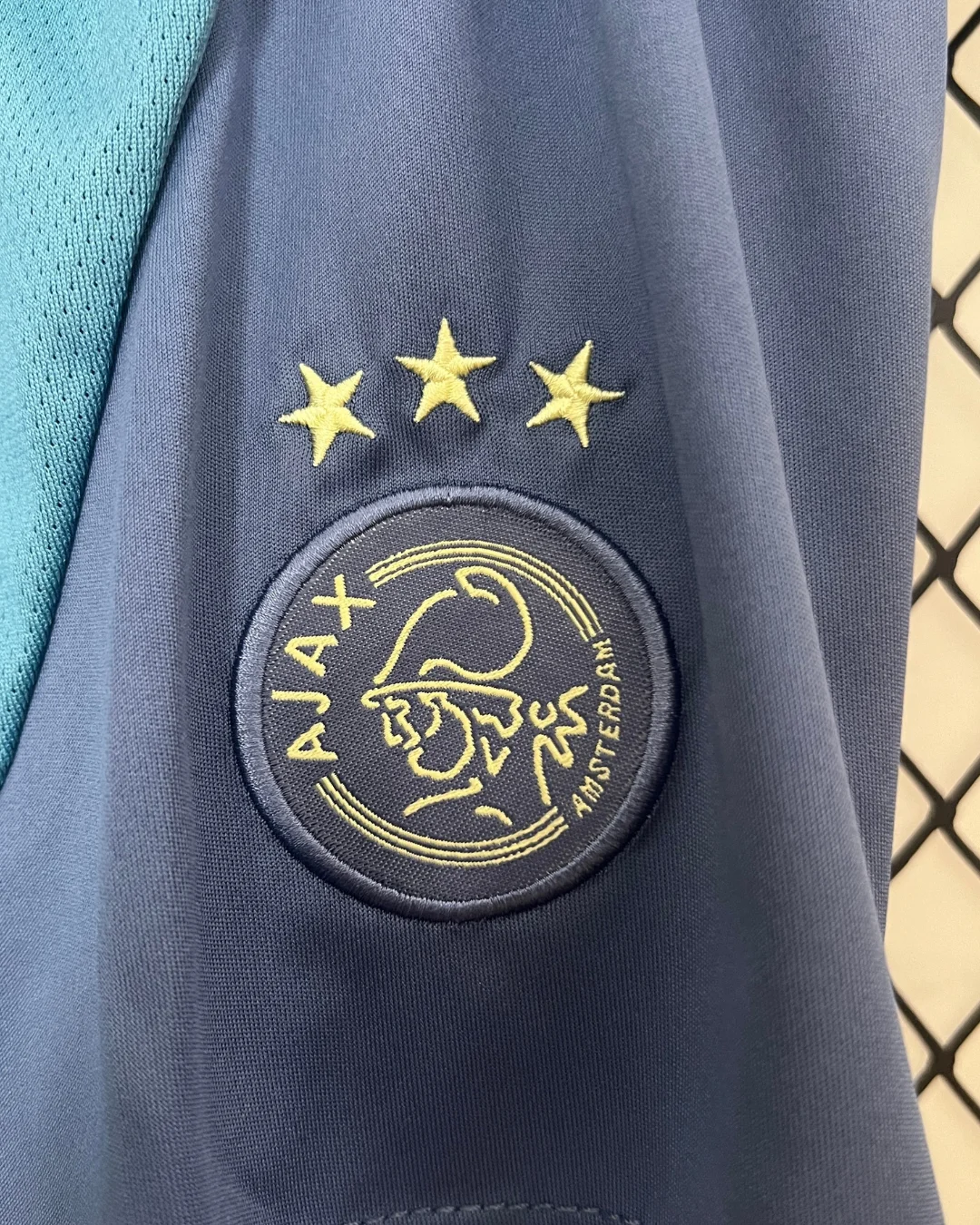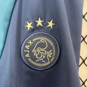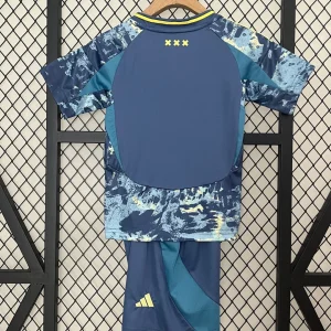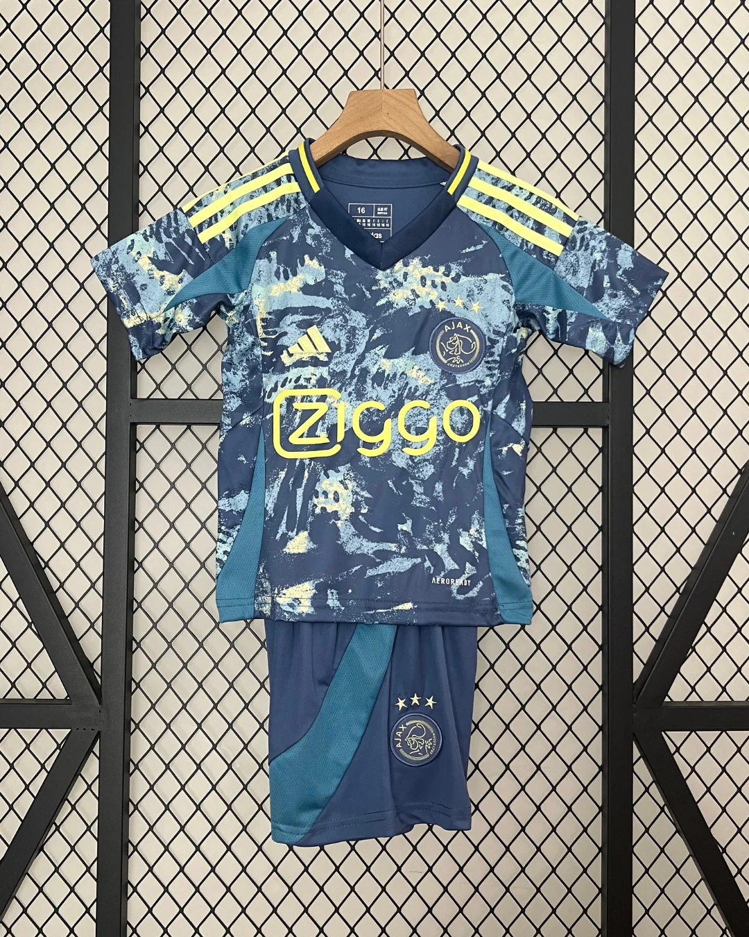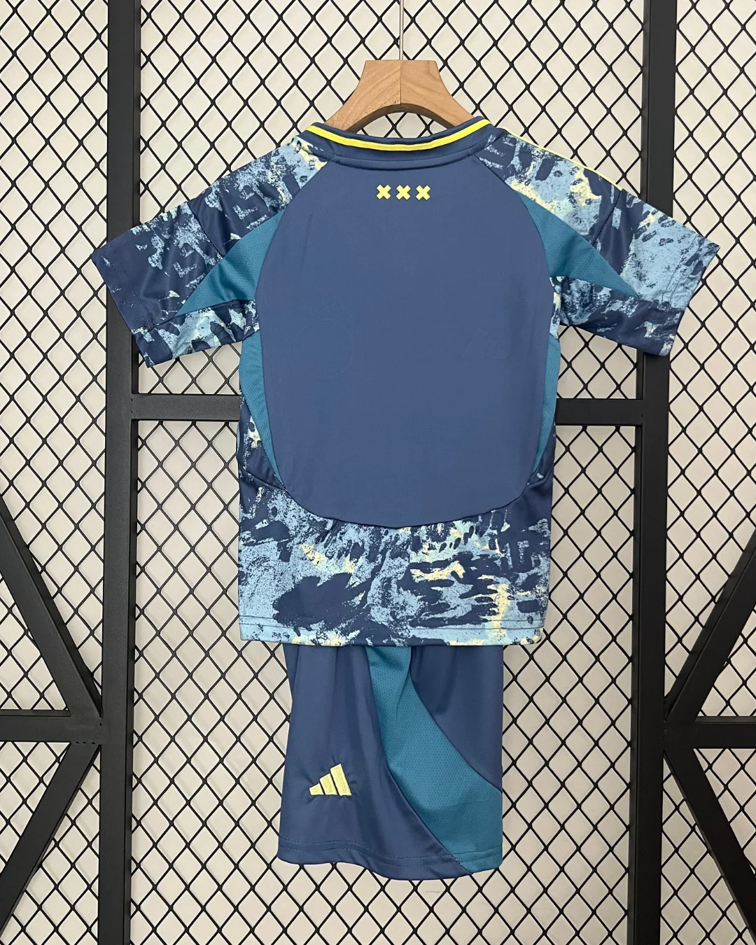AFC Ajax Kids 24/25 Away Kit pays tribute to Amsterdam’s artistic legacy with a navy blue base featuring a post-impressionist print inspired by Dutch masters, capturing the city’s creative spirit for young supporters.