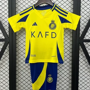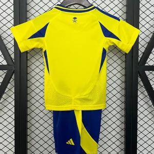 The Al Nassr Kids 24/25 Home Kit by Adidas features the club’s iconic yellow and royal blue colors, designed to reflect the team’s vibrant identity. This kids’ kit typically includes a short sleeve home jersey with a slim fit and a V-neck collar, showcasing the official Al Nassr crest prominently on the chest. It is made from lightweight polyester fabric with Adidas’ AEROREADY technology, which manages moisture to keep young players dry and comfortable during play.