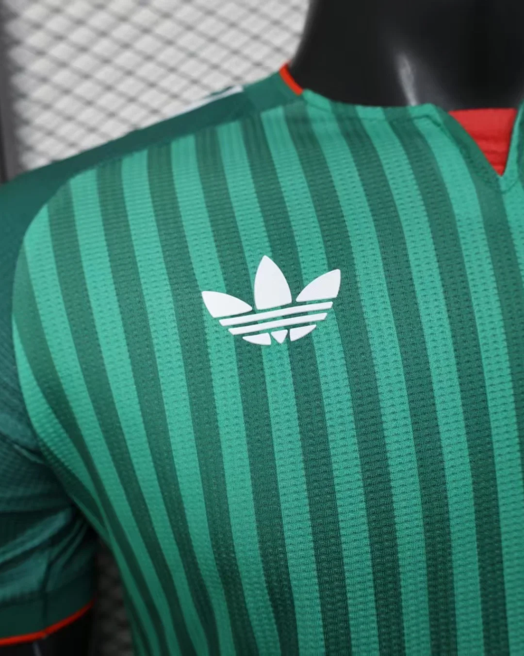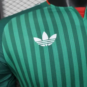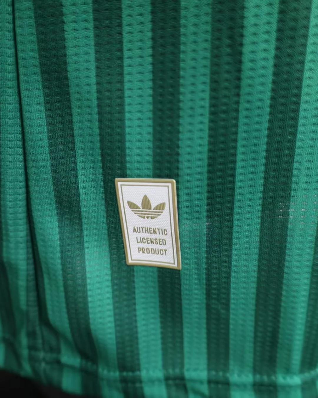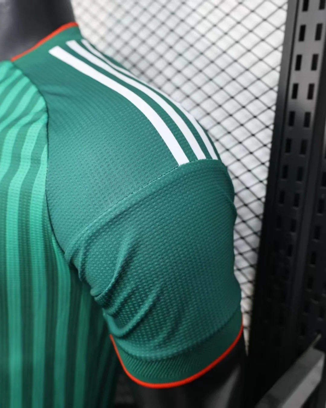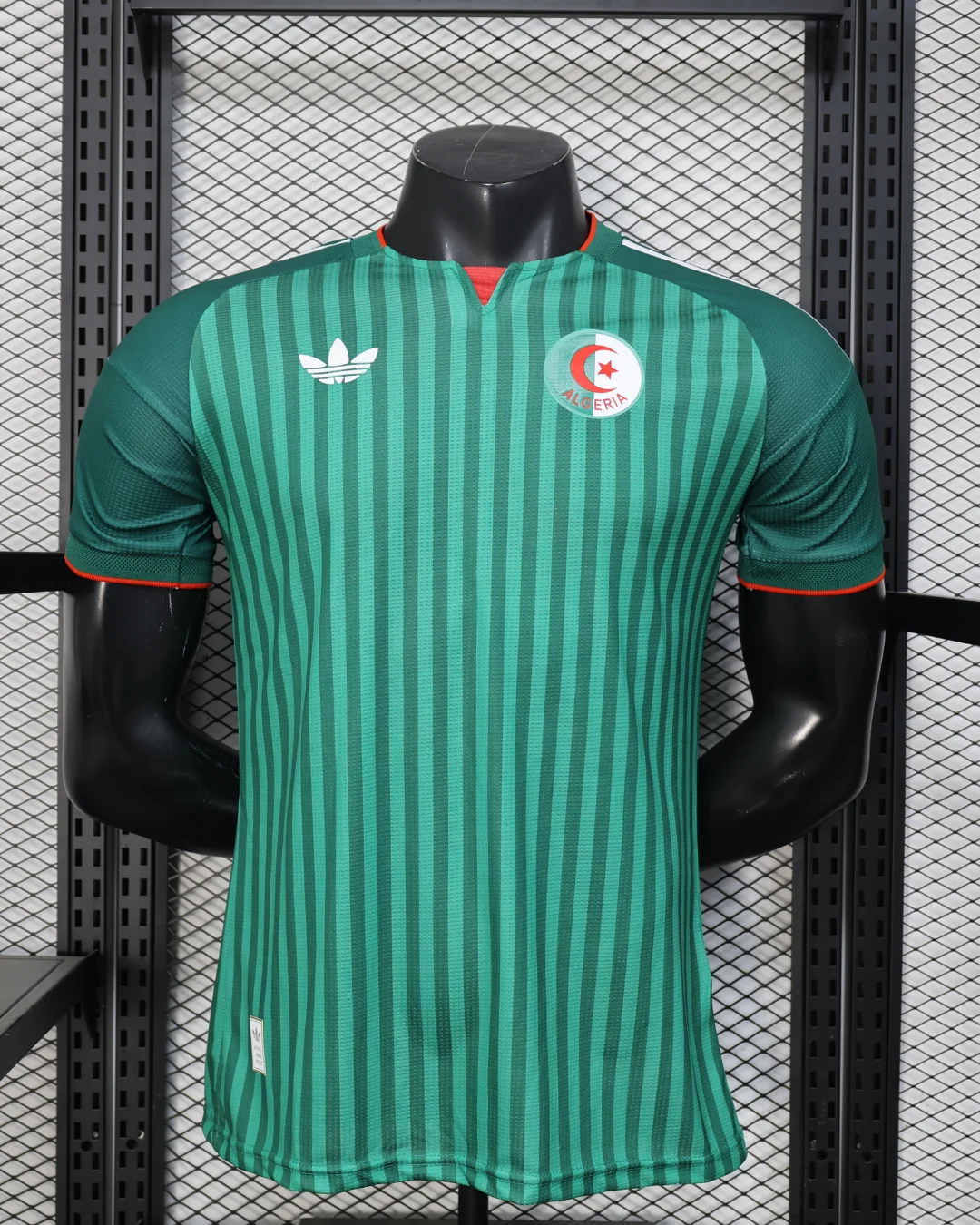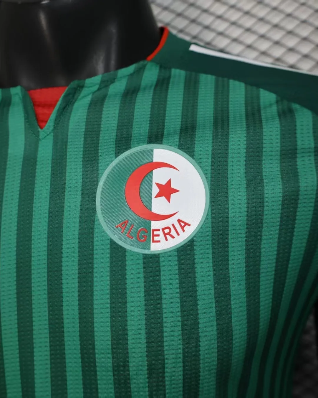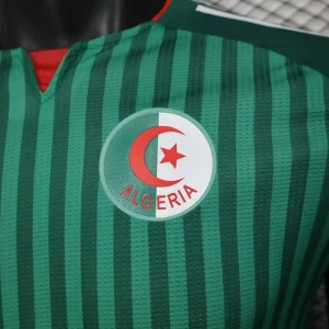 Fuel the Fennecs’ resilient World Cup campaign with the Algeria 2026 Away Authentic Jersey from Adidas. Featuring a rich Court Green base with tonal stripes and darker green sleeves creating vertical depth, it incorporates striking red accents on collar and cuffs plus white logos for patriotic flair, using the national flag crest instead of the federation badge to powerfully affirm Algerian identity. Engineered from 100% recycled polyester with Climacool+ technology, this jersey delivers superior moisture-wicking, breathability, and a slim authentic match fit identical to pro versions.