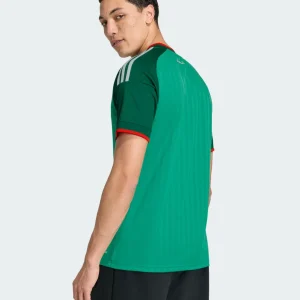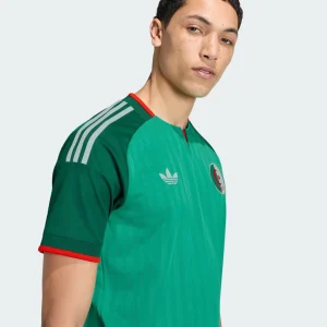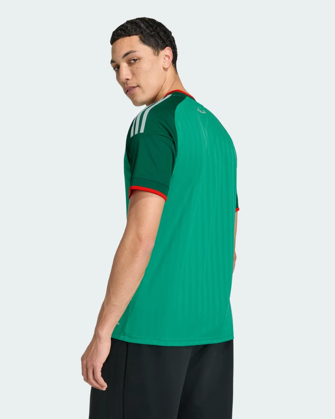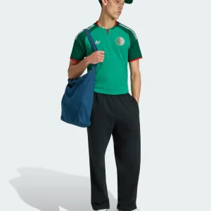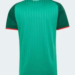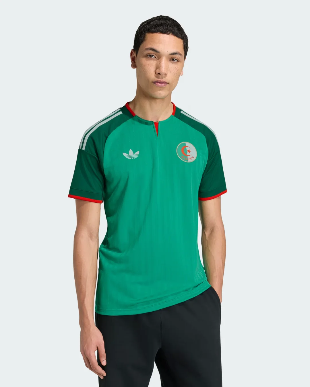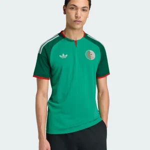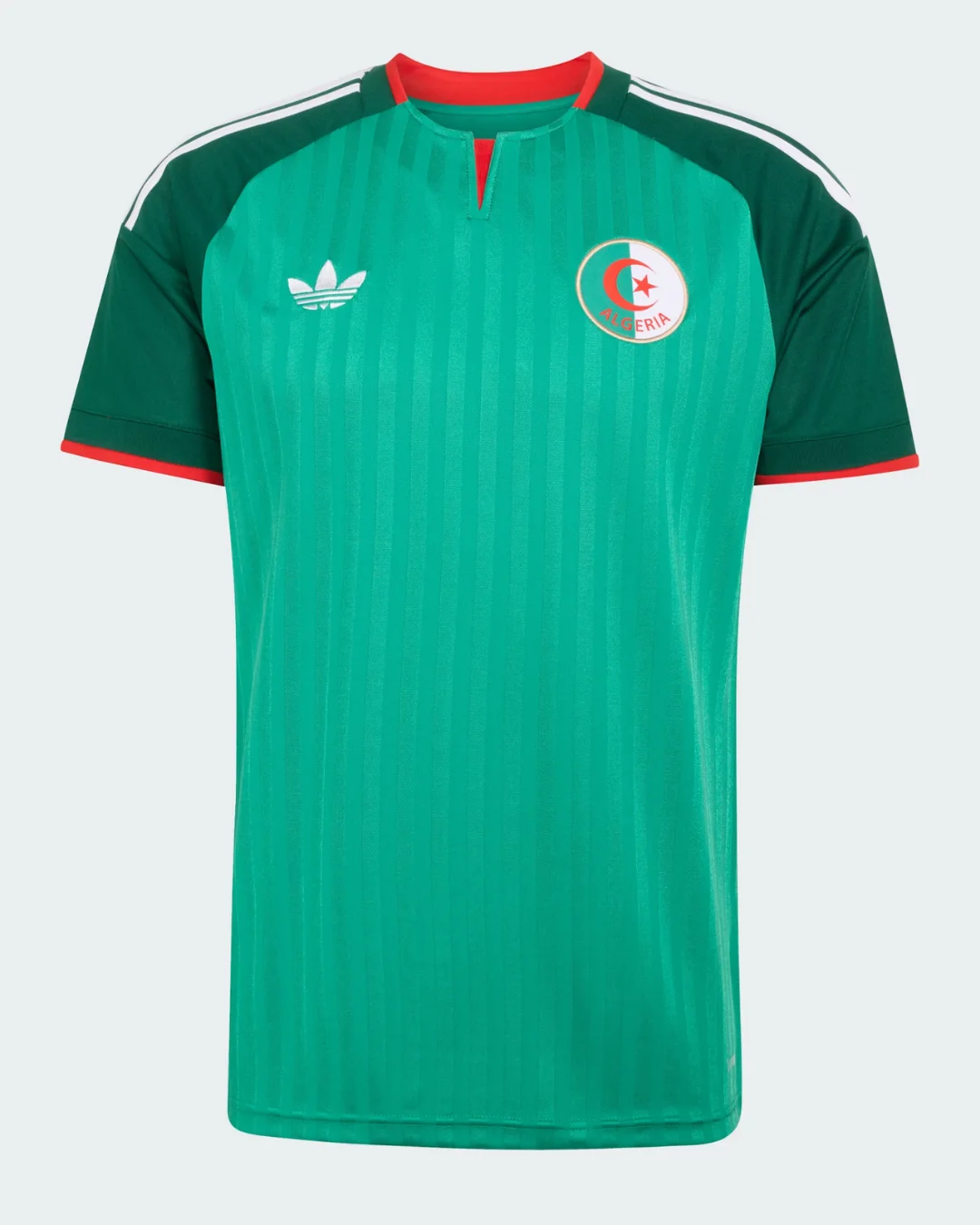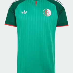 Experience Les Fennecs’ desert journey with the Algeria 2026 WC Away Stadium Jersey from Adidas, inspired by rocky deserts and lush oases. Deep “Court Green” base captures Algeria’s diverse landscapes, featuring subtle vertical tonal green stripes adding dimension, darker green sleeves for contrast, red accents on crew neck collar and cuffs honoring the national flag, national flag emblem replacing traditional federation crest, Adidas logo, “ALGERIA” in Arabic script across back neck, and slim athletic fit debuted in recent African qualifiers.