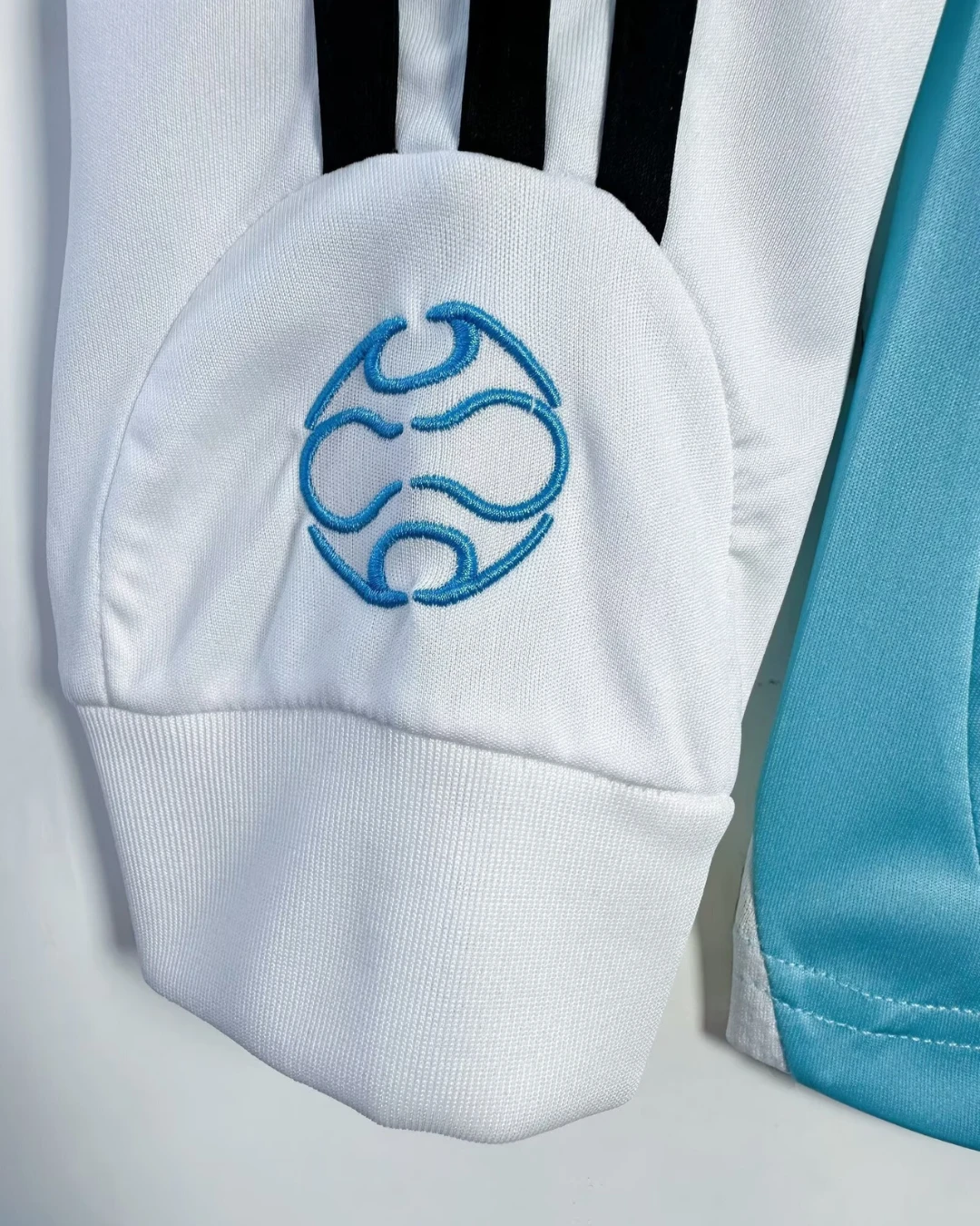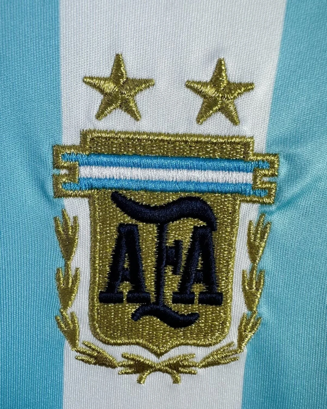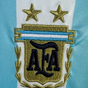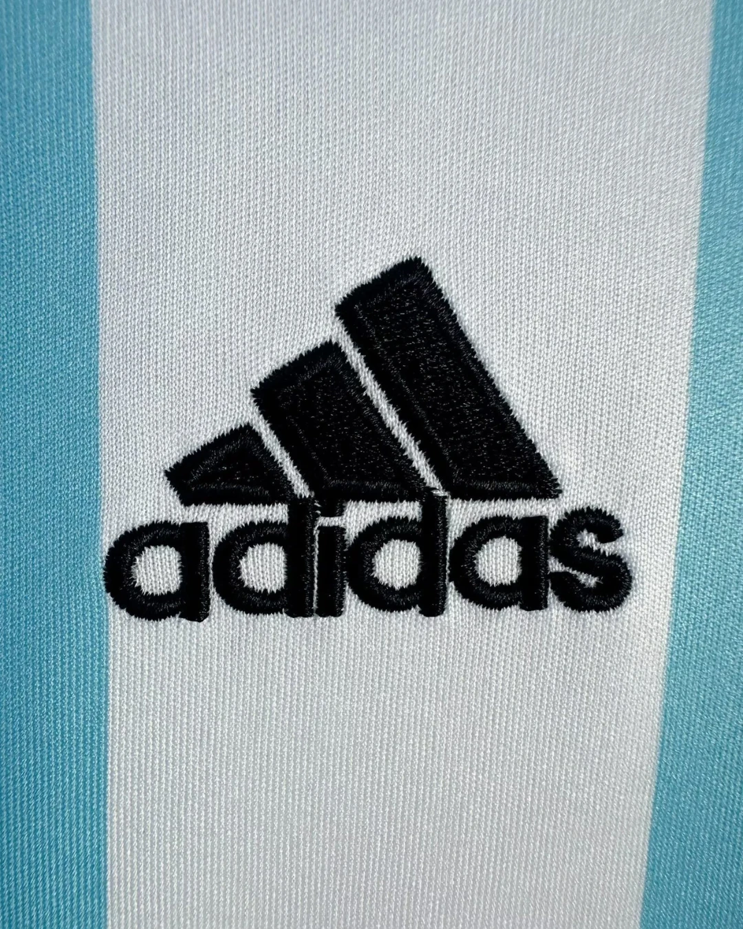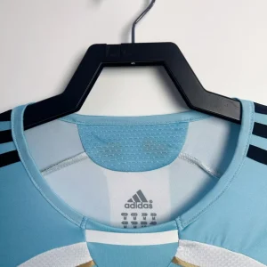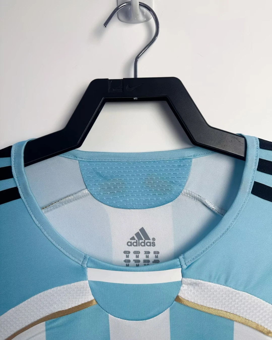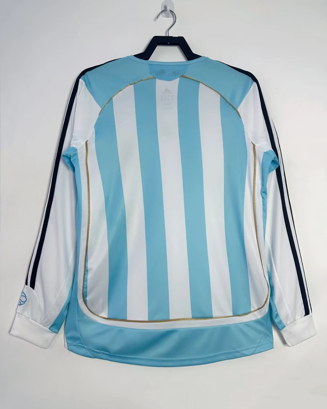 Argentina’s classic 2006 World Cup Long Sleeve Home Jersey from Adidas powered José Pékerman’s quarterfinal campaign in Germany, featuring Lionel Messi’s international debut alongside Juan Román Riquelme, Hernán Crespo, Carlos Tevez, and Javier Saviola during their stylish tournament run. The timeless sky blue and white vertical stripes showcase a clean crew neck collar, embroidered AFA crest on left chest, Adidas logo on the center, and sponsor-free purity across the chest, elegant Albiceleste design embodying Riquelme’s artistry before Germany’s penalty heartbreak.