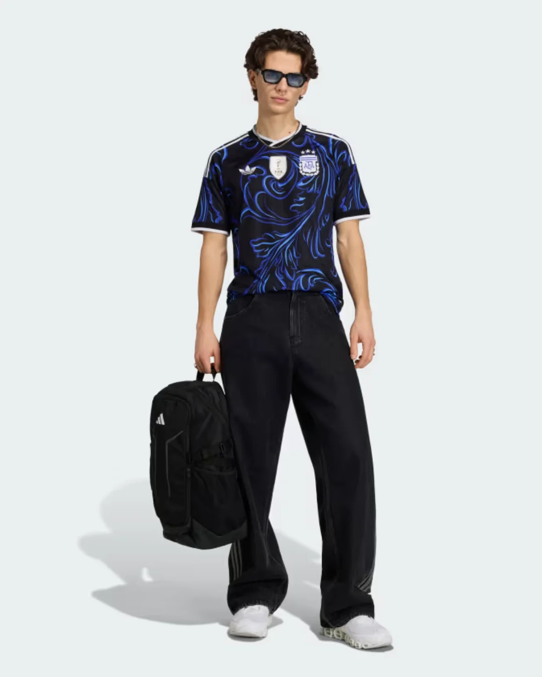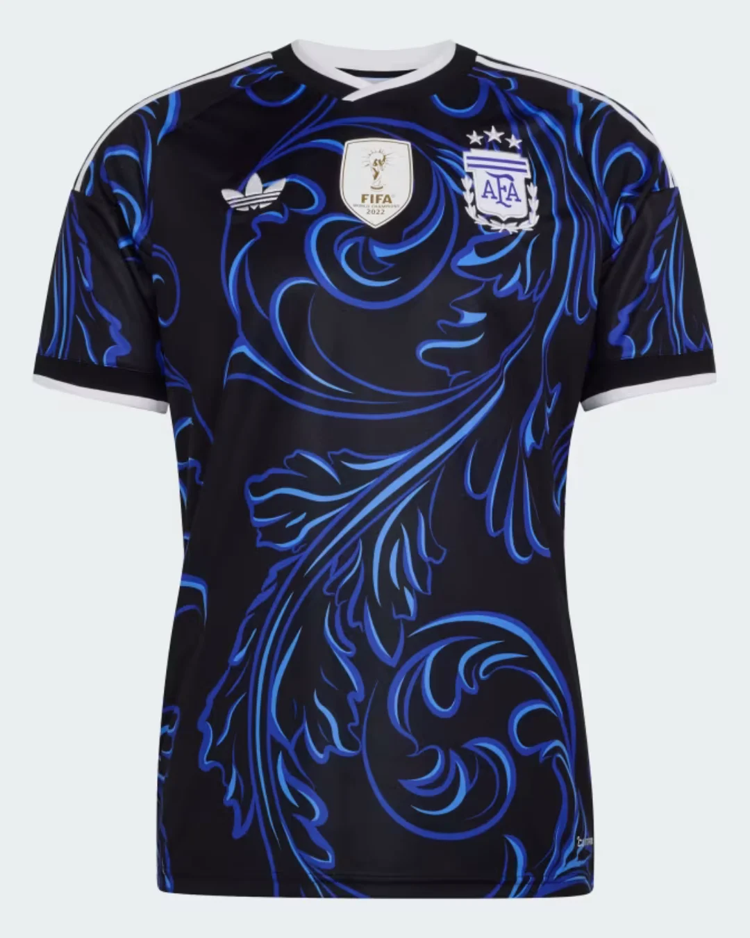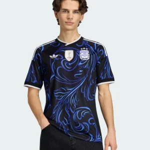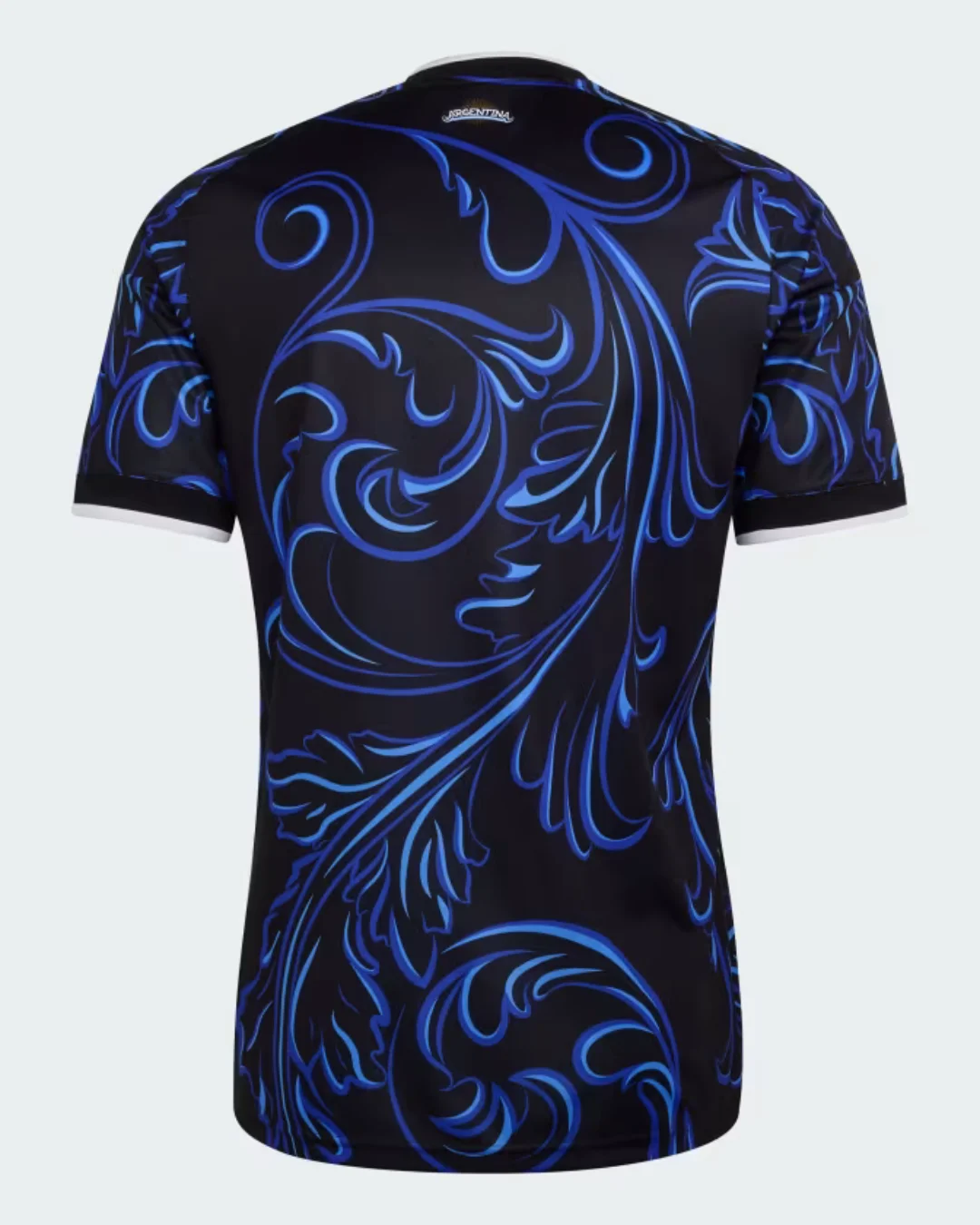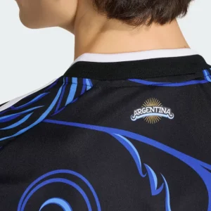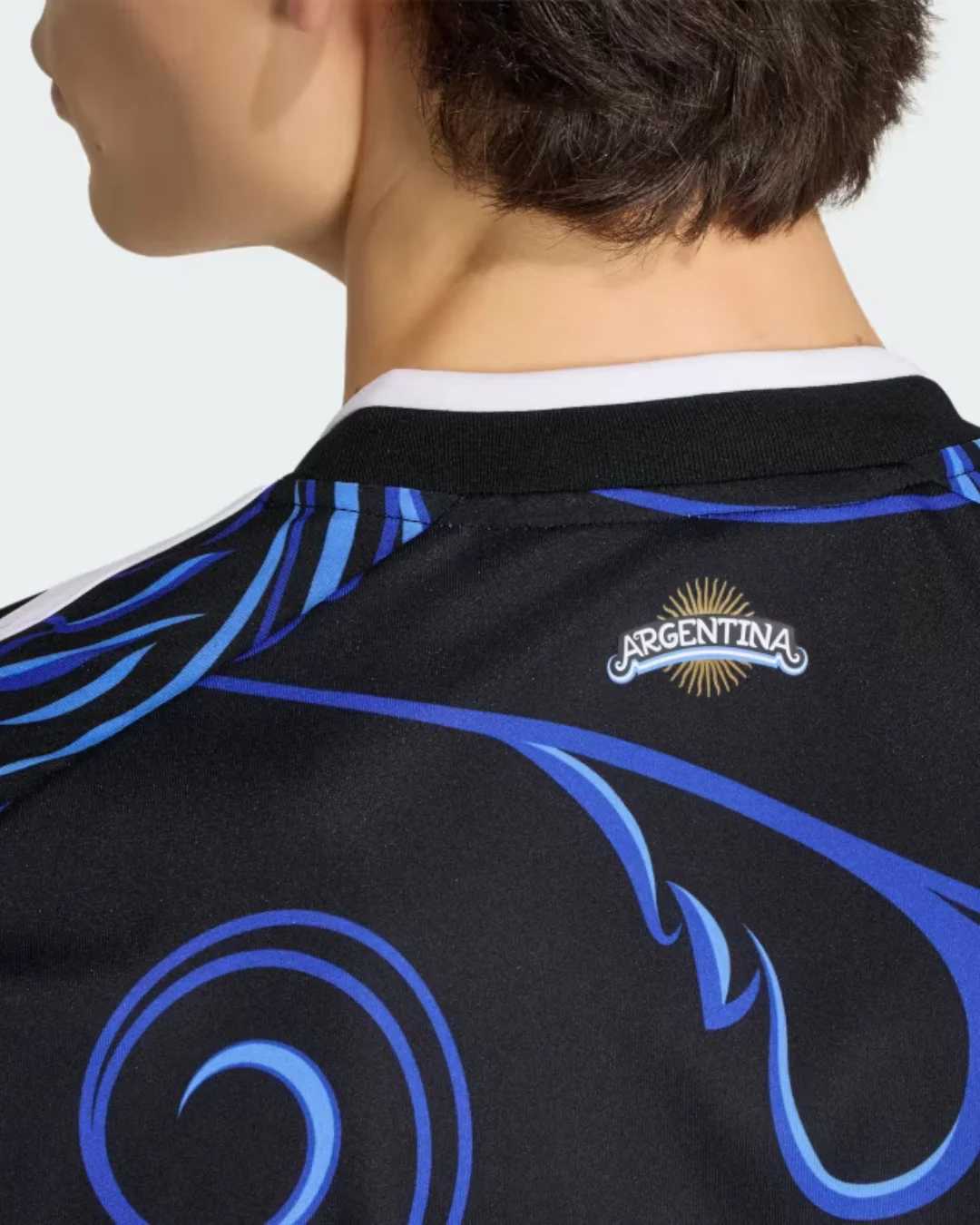 Fuel La Albiceleste’s quest for World Cup immortality with the Argentina 2026 WC Away Stadium Jersey from Adidas. Predominantly sleek black base celebrating Argentine artistic heritage, it features an intricate all-over pattern of swirling floral motifs and climbing plants inspired by traditional Fileteado Porteño street art from Buenos Aires, rendered in vibrant Lucid Blue and Blue Burst shades with subtle sky blue accents. The iconic Trefoil Adidas logo sits proudly alongside the 2022 FIFA World Cup Champions patch and embroidered AFA crest (sun-embellished with three World Cup stars), high crewneck collar, and dynamic jacquard texture creating visual depth and movement.