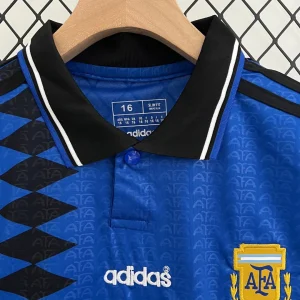 Argentina’s iconic 1994 World Cup Away Kids Jersey from Adidas captures the passion of that USA tournament era, featuring a striking blue base with bold geometric patterns of black diamond stripes in right side creating visual dynamism, one-button polo collar, worn during their group stage campaign despite Diego Maradona’s early exit. Perfect for young Albiceleste fans, this retro replica uses 100% recycled polyester jacquard fabric for breathability and sustainability, engineered 3-Stripes on shoulders, woven Argentina crest on left chest, sewn-on AFA badge above hem and loose relaxed kids fit.