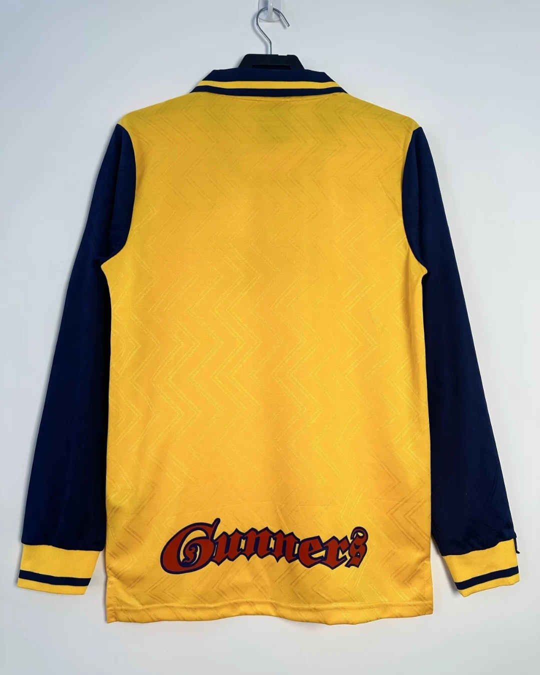 Arsenal’s legendary 1996/97 Long Sleeve Away Jersey from Nike marked Arsène Wenger’s transformative debut season at Highbury, powering their third-place Premier League finish and UEFA Cup qualification with Ian Wright, Dennis Bergkamp, and Patrick Vieira. The iconic yellow base with navy blue accents features extended long sleeves for winter fixtures, V-neck collar, embroidered cannon crest on left chest, Nike Swoosh opposite, and prominent “JVC” sponsor across the front, vibrant design symbolizing Wenger’s early revolution.