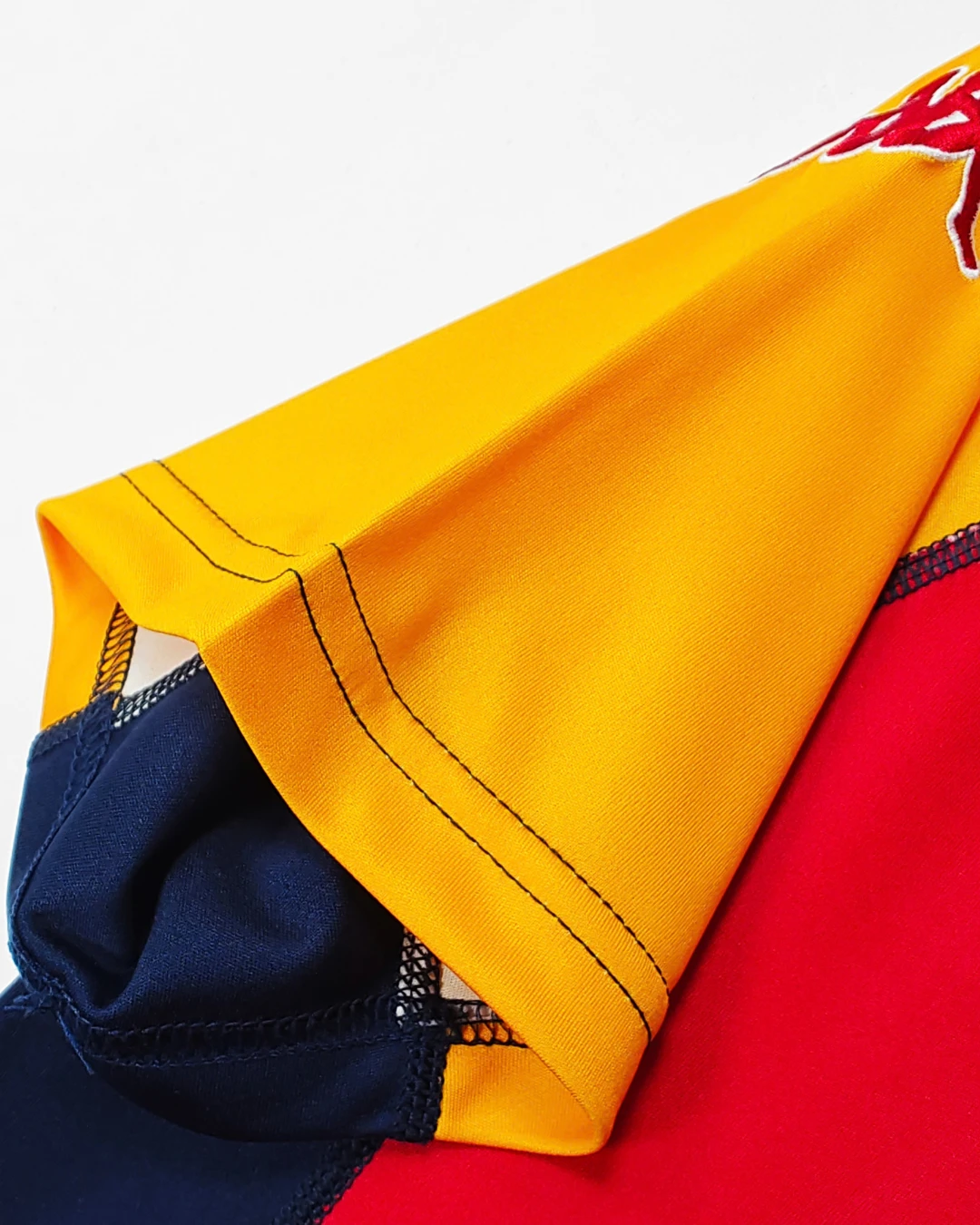 AS Roma’s distinctive 2001/02 Champions League Home Jersey from Kappa powered Fabio Capello’s squad through the group stages during their title defense season, featuring the iconic half-and-half split design with right side traditional Giallorossi carmine red, left side bright orange (mimicking sunset over Rome), INA Assitalia sponsor in navy across the chest, Scudetto shield badge from their previous Serie A triumph, worn as they reached the second group stage. Perfect for young Giallorossi fans, this retro UCL replica uses breathable 100% polyester construction replicating Kappa’s texture, embroidered wolf-head lupetto crest, distinctive Kappa logos positioned diagonally on both shoulders, short sleeves and regular relaxed fit.