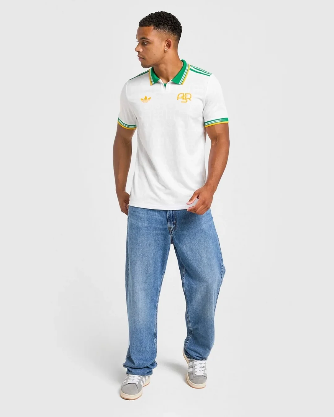 White base with green polo collar and Adidas three stripes