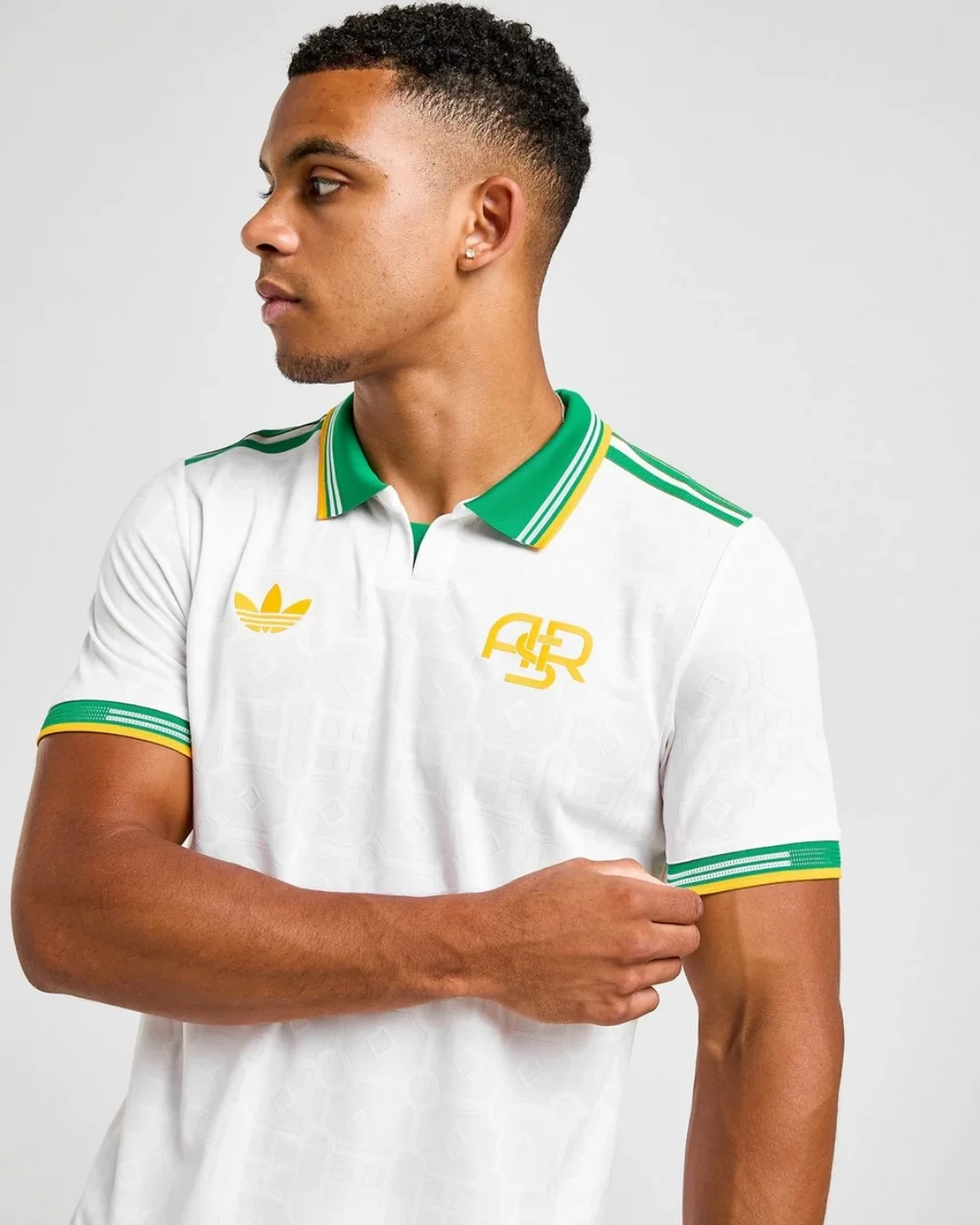 The AS Roma 2025/26 Third Authentic Jersey by Adidas is a standout homage to the natural and historical heritage of Rome, blending retro aesthetics with modern performance technology. The jersey features a pristine white base, accented by a rich green polo collar and matching green Adidas three stripes on the shoulders—a tribute to the lush greenery of Roman villas and iconic Italian gardens. Bright gold logos and the traditional “ASR” trigram add a striking contrast, enhancing the kit’s vintage flair.