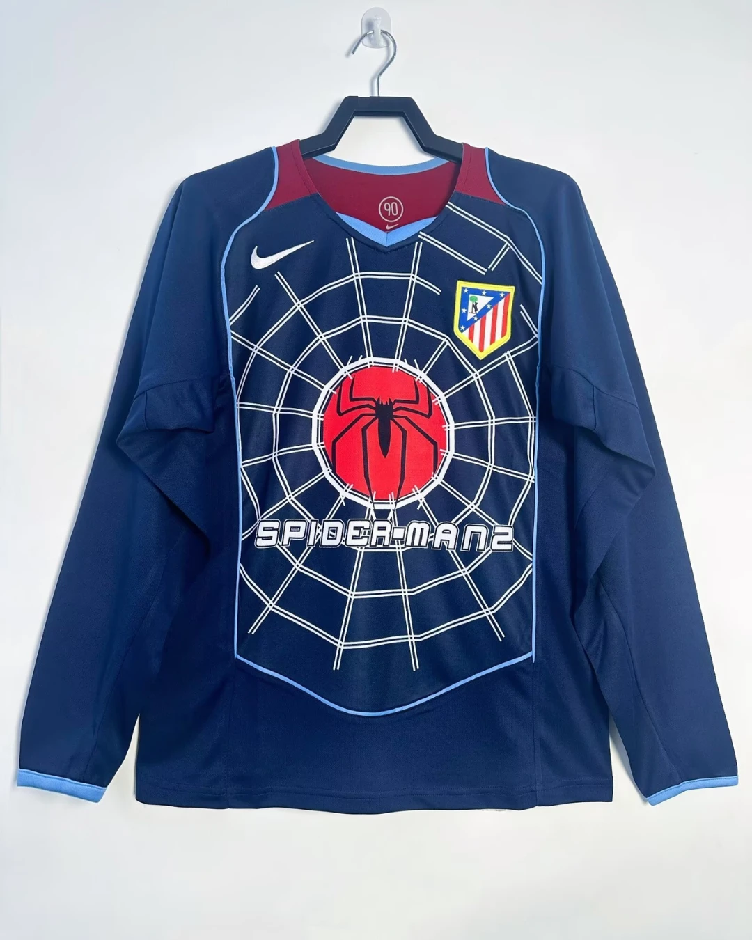 Step into one of Atletico Madrid’s memorable seasons with the 2004/05 Away Jersey – Long Sleeve, famously nicknamed the “Spiderman” shirt due to its unique web-like design pattern. Manufactured by Nike, this bold and striking jersey features a deep blue base and red and light blue accents with a white spider web graphic spread across the fabric, reflecting the team’s fearless and dynamic approach.