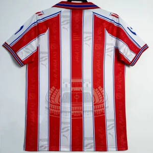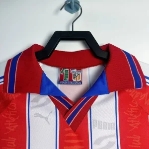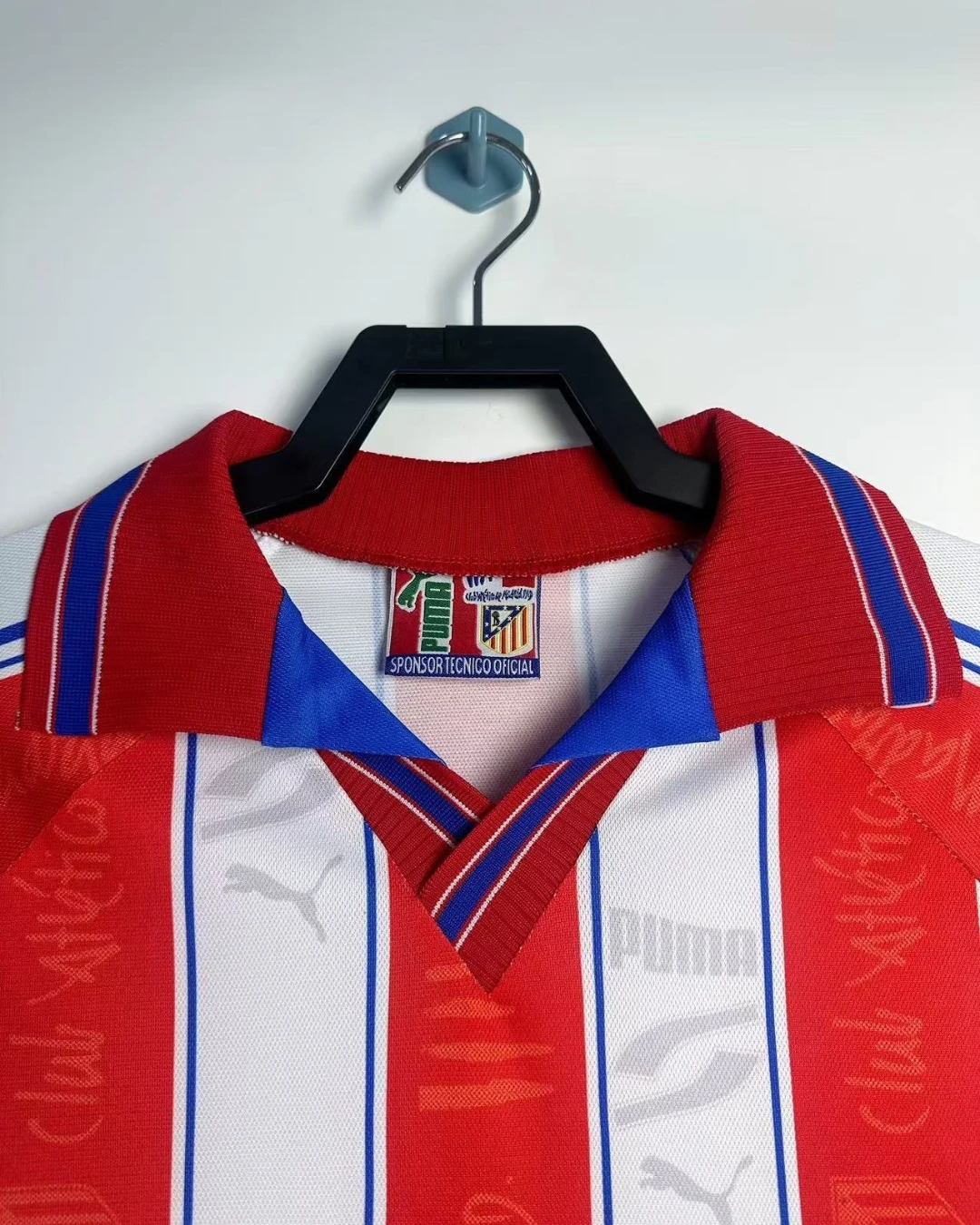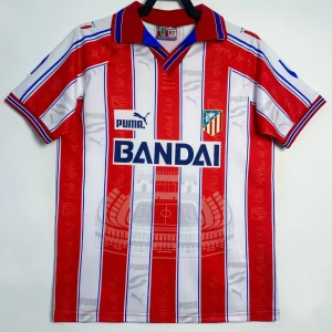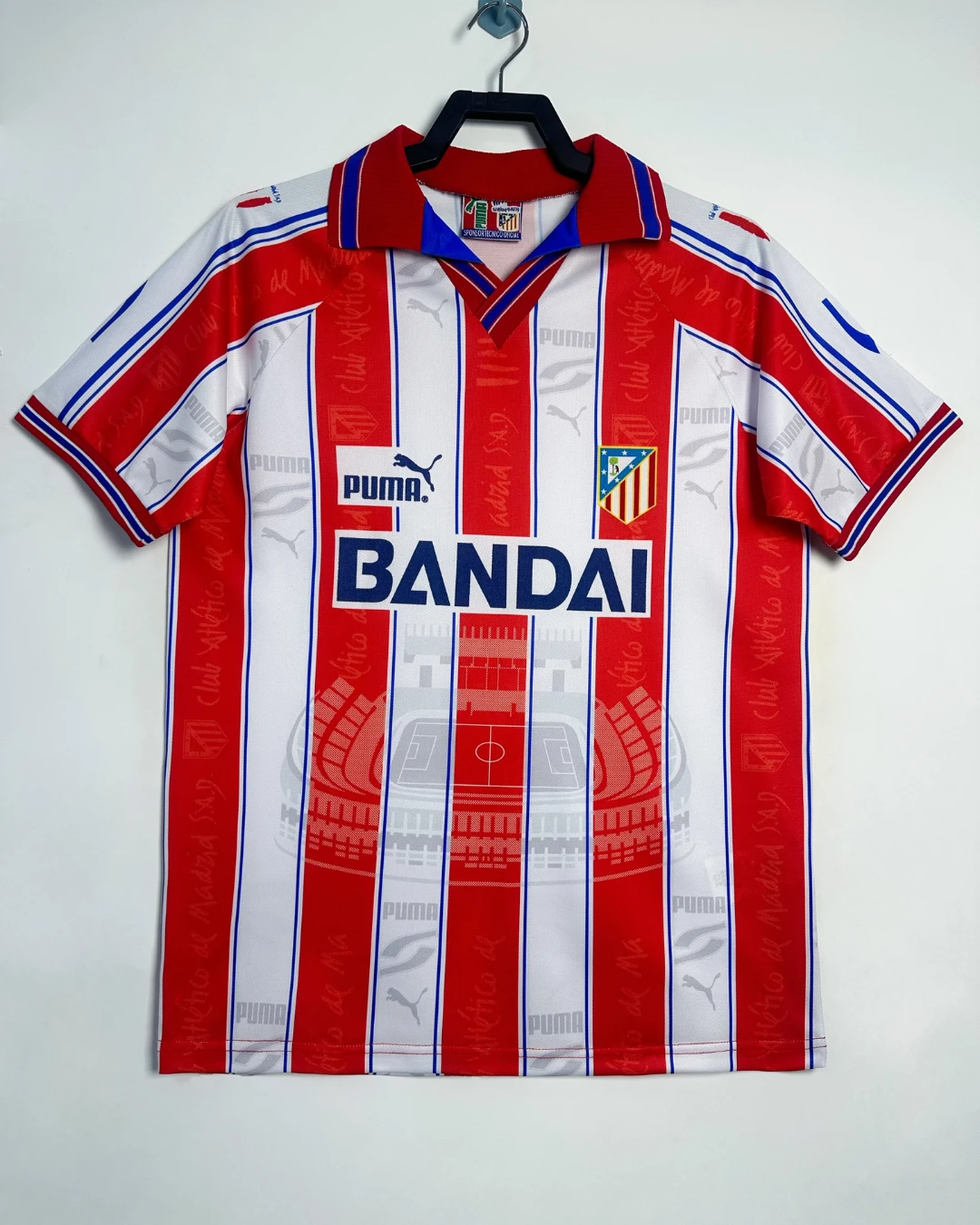 Atlético Madrid 1996/97 Home Jersey from Puma powered their competitive La Liga season and Champions League quarter-final run, worn by stars during Luis Aragonés’ rebuilding campaign at the Vicente Calderón. The iconic red and white vertical stripes feature blue accents, the traditional bear and strawberry tree crest embroidered on the left chest, Puma logo on the right, and bold “BANDAI” sponsor across the front, capturing quintessential colchonero passion from mid-90s Spanish football.