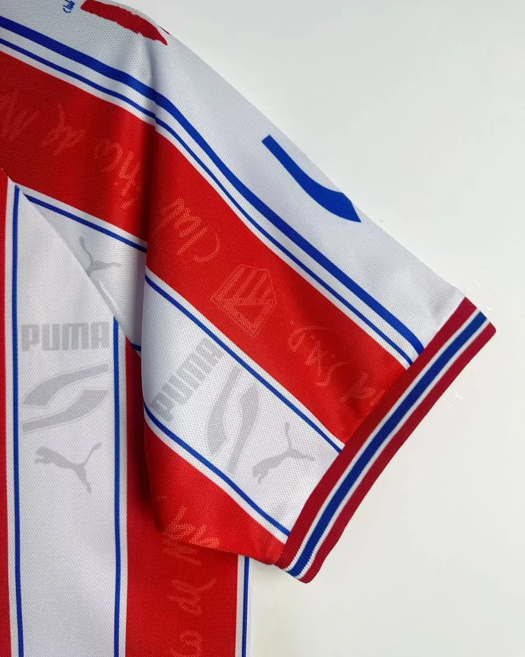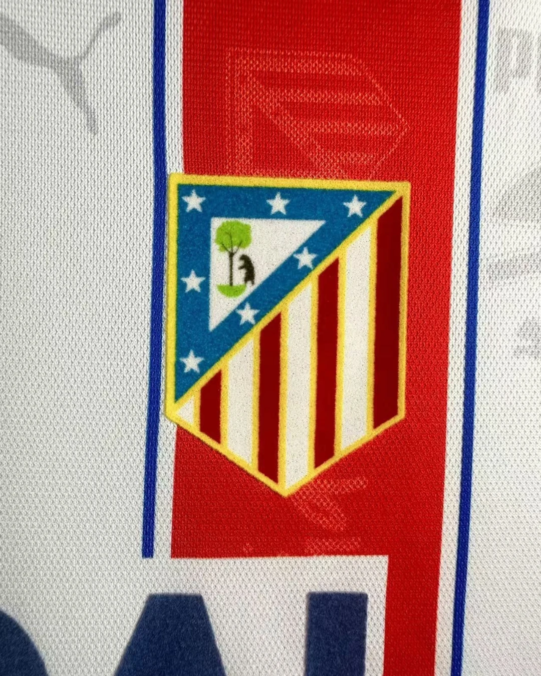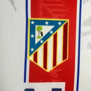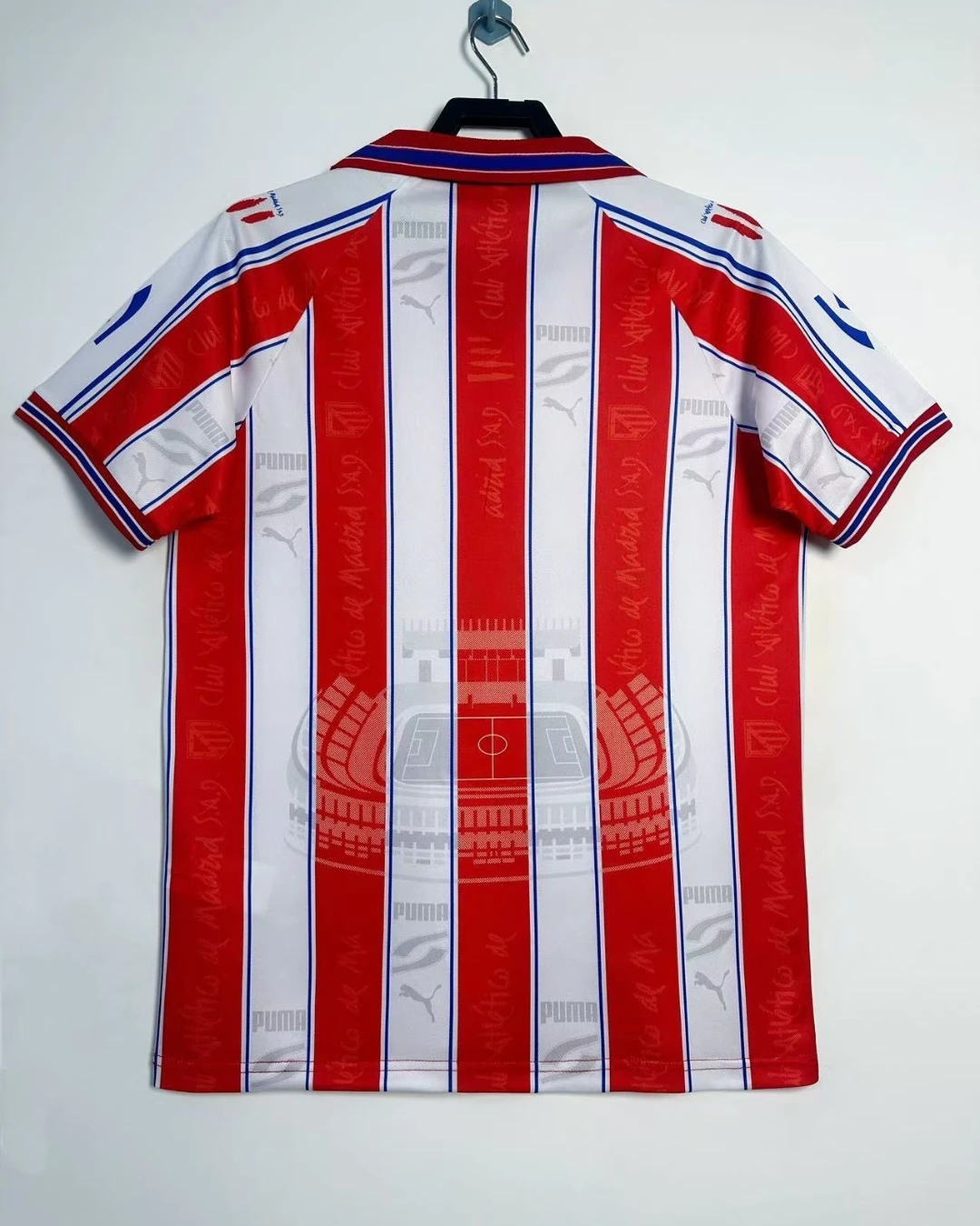 Atlético Madrid 1996/97 Home Jersey from Puma powered their competitive La Liga season and Champions League quarter-final run, worn by stars during Luis Aragonés’ rebuilding campaign at the Vicente Calderón. The iconic red and white vertical stripes feature blue accents, the traditional bear and strawberry tree crest embroidered on the left chest, Puma logo on the right, and bold “BANDAI” sponsor across the front, capturing quintessential colchonero passion from mid-90s Spanish football.