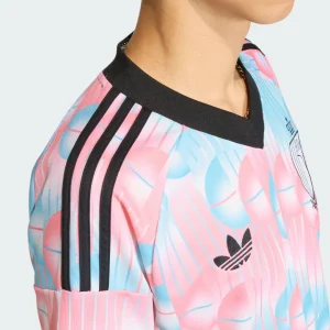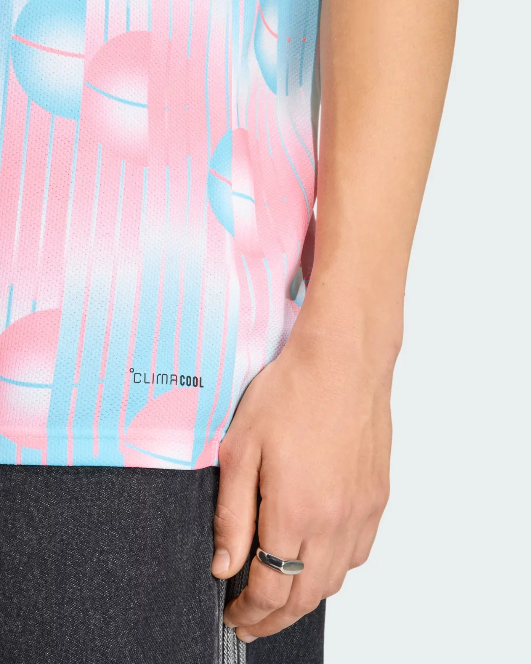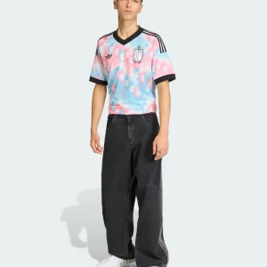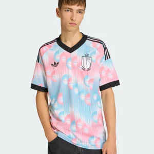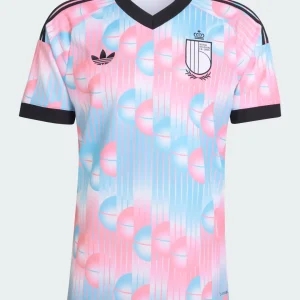Unleash the Red Devils’ artistic flair with the Belgium 2026 WC Away Stadium Jersey from Adidas. Predominantly Frozen Blue and Light Pink base channeling Belgium’s surrealist heritage like René Magritte’s masterpieces, it features abstract spherical block patterns blended with RBFA crest elements, vertical pitch-line detailing, black V-neck collar and sleeve cuffs, black Adidas shoulder stripes, Trefoil logo on the right chest, and embroidered Royal Belgian FA crest for striking cultural fusion debuted in recent qualifiers.