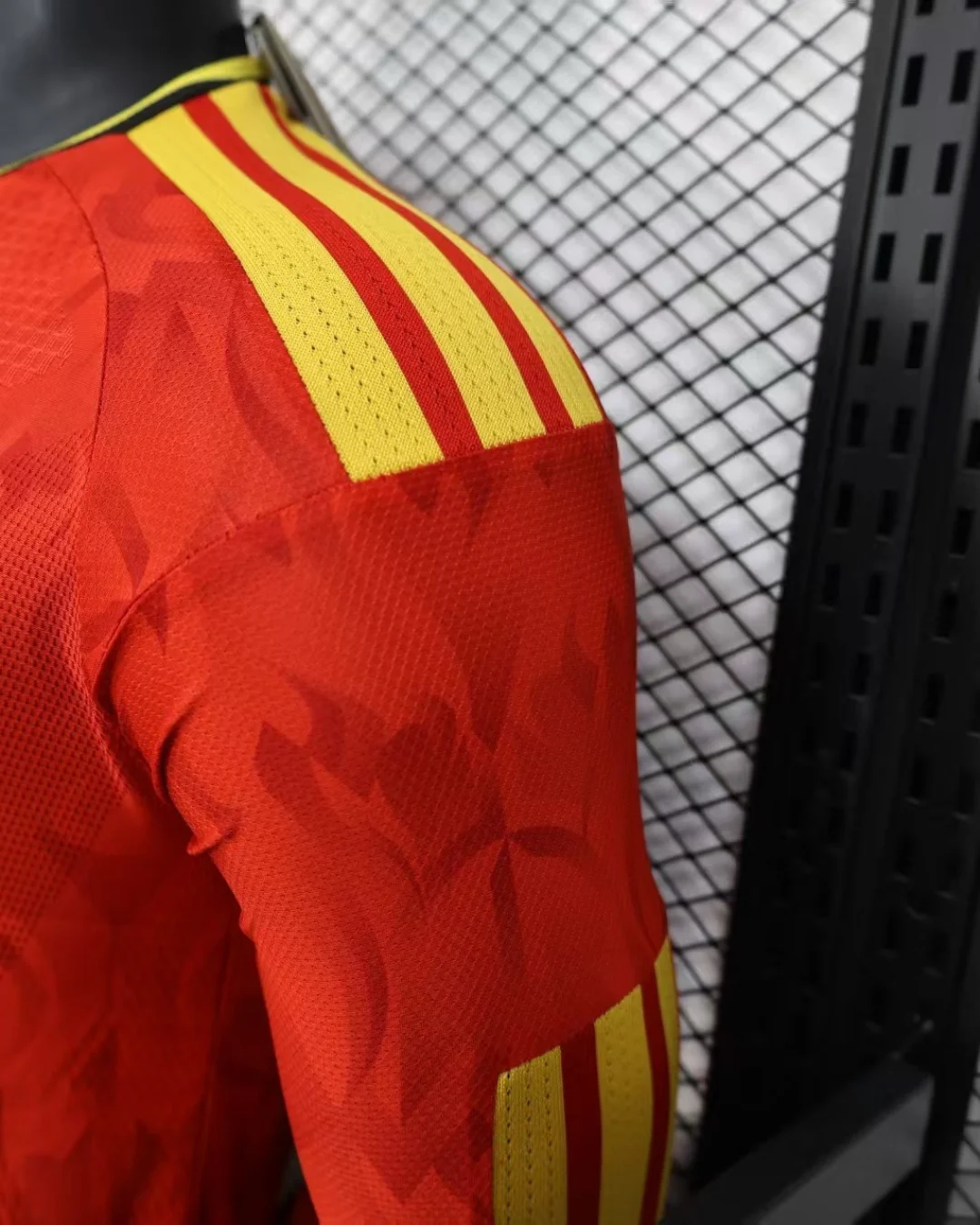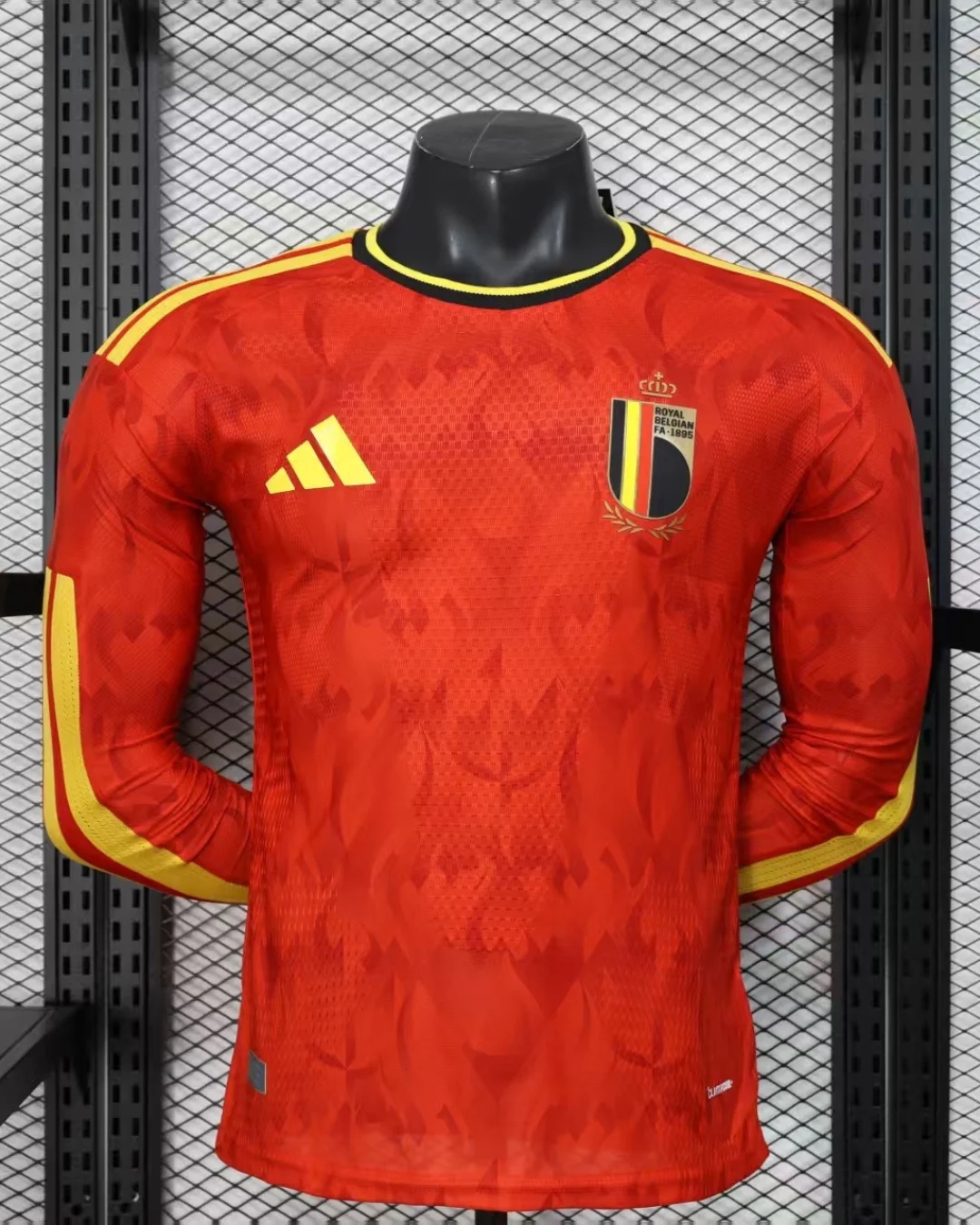 The adidas Belgium 2026 World Cup Home Authentic Long Sleeve Jersey embodies the Red Devils’ fearless spirit with a vibrant red base featuring dynamic flame motifs and devil-inspired graphics woven into the transfer knit jacquard fabric, symbolizing bravery and national pride.
