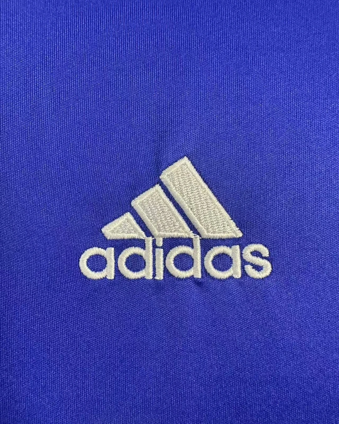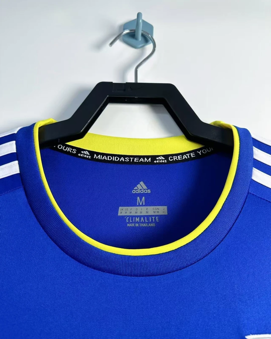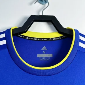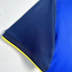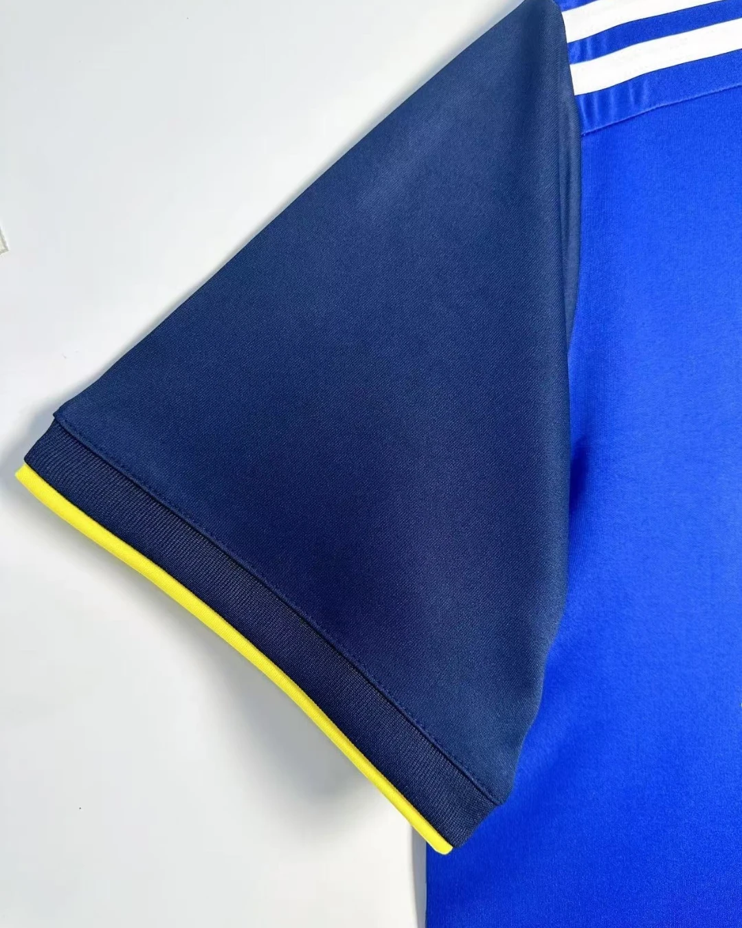 • Royal blue base with navy sleeves, white shoulder stripes, yellow accents
