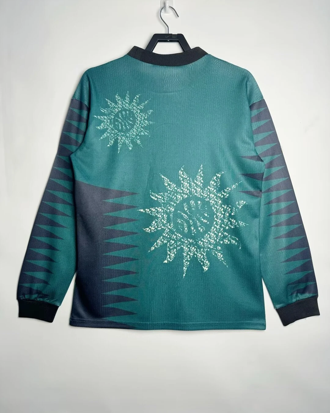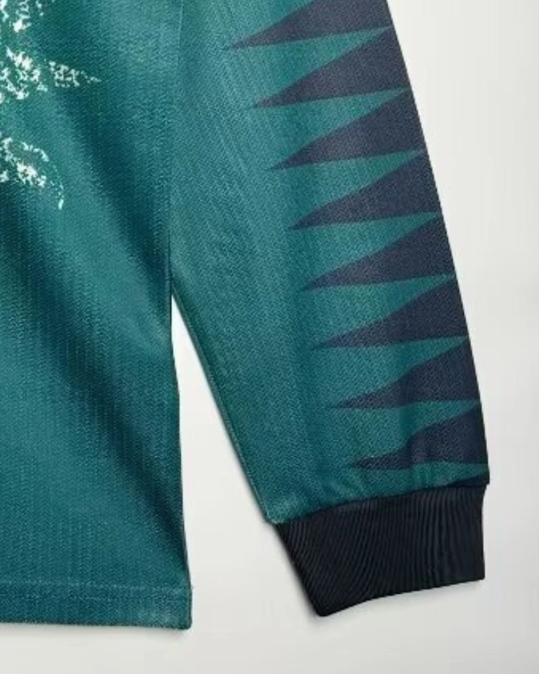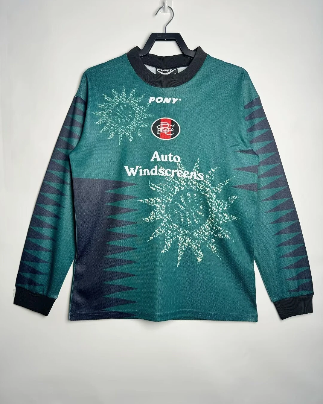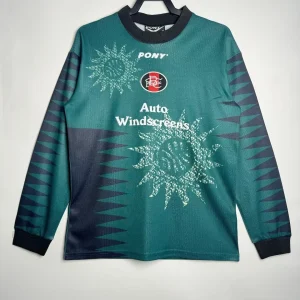 Birmingham City’s 1996/97 Long Sleeve Goalkeeper Jersey from Pony equipped keepers Ian Bennett and Kevin Poole during Barry Fry’s First Division playoff push at St Andrew’s, providing cold-weather protection and high visibility for nighttime fixtures and winter promotion battles. The teal base features white sun graphics and black geometric patterns on the sleeves and sides, extended ribbed long cuffs for glove compatibility, prominent “AUTO WINDSCREENS” sponsor across the chest, embroidered BCFC crest, and Pony logo, specialist 90s keeper design prioritizing shot-stopping performance.