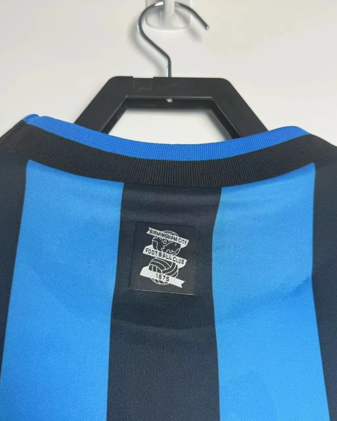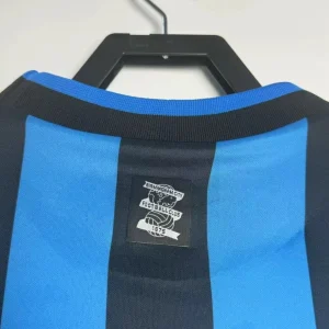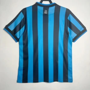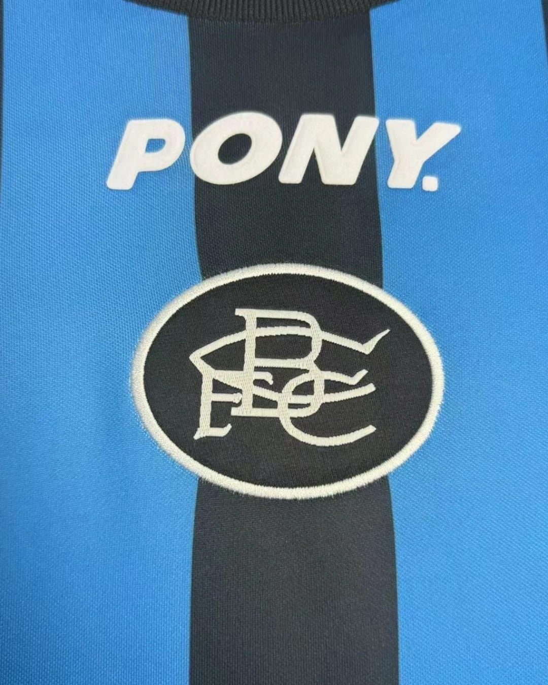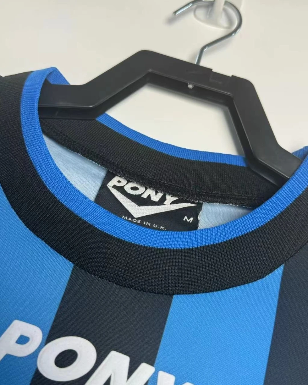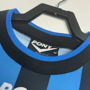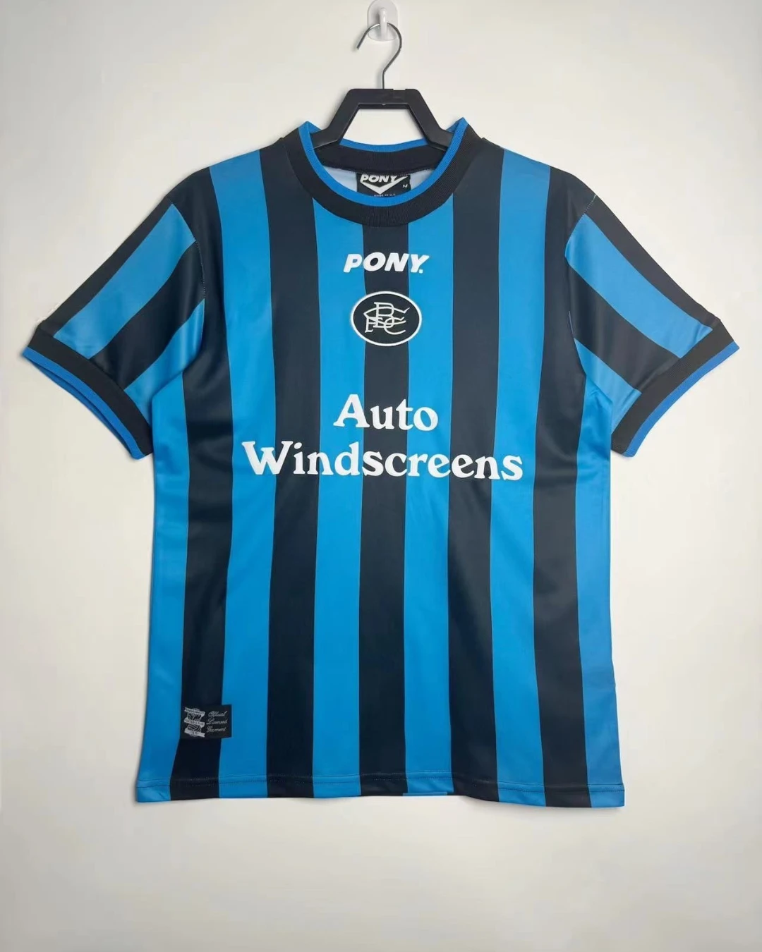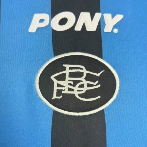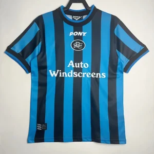 Birmingham City’s 1996/97 Third Jersey from Pony supported Barry Fry’s Blues during their First Division playoff campaign at St Andrew’s, featuring cult heroes like Gary Poole, Steve Claridge, and Kevin Francis as they battled for Premier League promotion. The distinctive design showcases blue and black vertical stripes throughout, embroidered BCFC crest, Pony logo and prominent “AUTO WINDSCREENS” sponsor across the center, and clean crew neck collar, quintessential mid-90s third kit rarity worn sparingly in cup competitions.