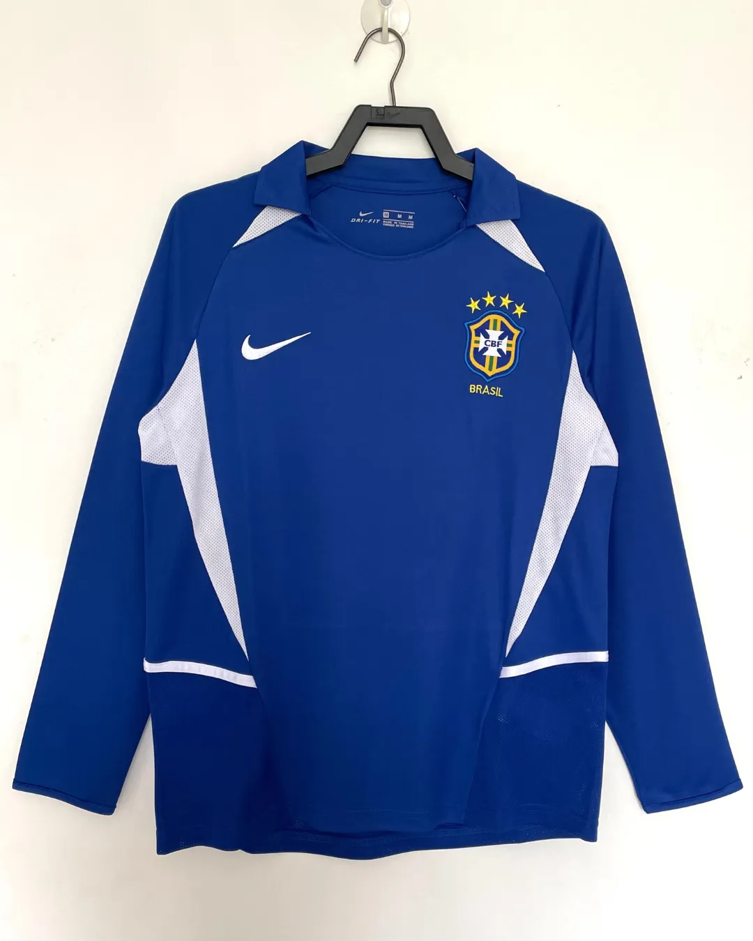 Celebrate Brazil’s fifth World Cup triumph with the iconic 2002 Away Jersey – Long Sleeve from Nike, worn by Ronaldinho, Ronaldo, Rivaldo, and Cafu during their flawless Japan/South Korea campaign. The striking blue base showcases the classic yellow 4-star CBF crest on the left chest, Nike Swoosh in yellow on the right, and Nike’s Dri-FIT technology.