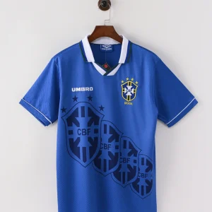 Celebrate the iconic style of the mid-1990s with the Brazil 95/96 Away Jersey, a classic kit worn by legends of the Samba Boys during a memorable era. This away jersey features the traditional blue base color, accented with white and green trim, reflecting the vibrant colors of the Brazilian flag while maintaining a sleek and modern design.