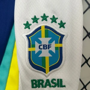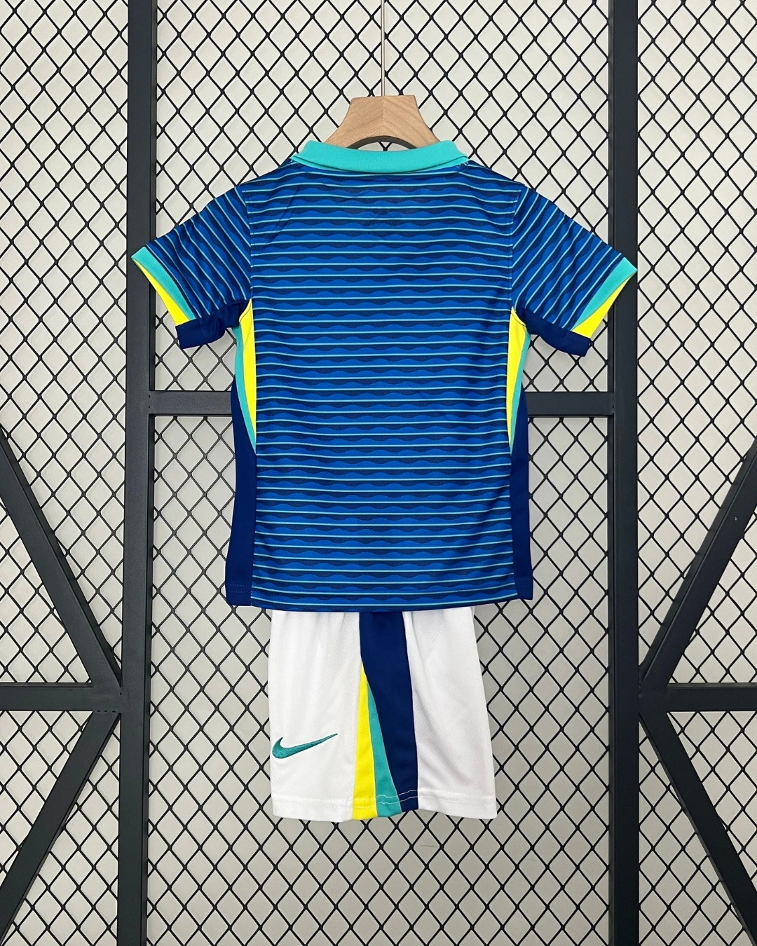 Brazil’s 2024 Away Kids Jersey from Nike captures the chaotic natural beauty of Brazil’s beaches and jungles through a striking blue “Soar” base with turquoise and dynamic yellow accents, designed to honor the Seleção’s five World Cup triumphs while powering Copa América and World Cup qualifying campaigns. Perfect for young Pentacampeões fans, this Stadium replica showcases Nike Dri-FIT moisture-wicking technology for dry comfort, ventilated mesh paneling for breathability, embroidered CBF crest and Nike Swoosh, short sleeves, lightweight 100% polyester construction, standard kids fit.