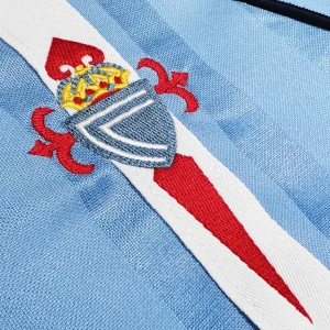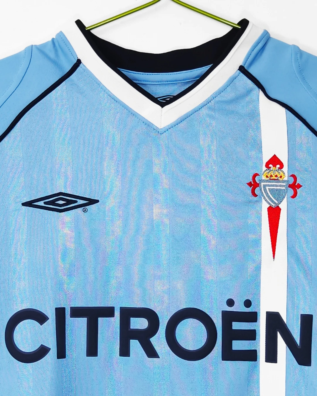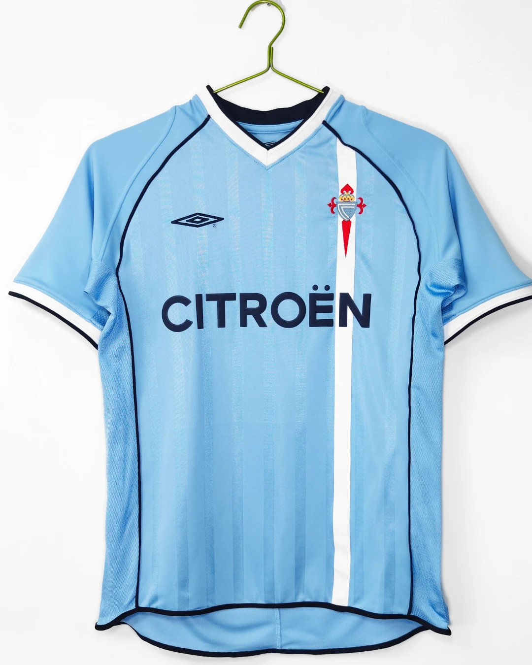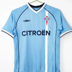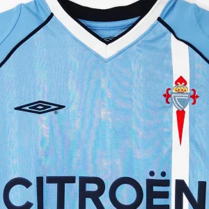 Celta Vigo’s 2001-2003 Home Jersey from Umbro defined their golden UEFA Cup semifinal era and La Liga top-6 finishes at Balaídos, featuring the iconic sky blue base with navy blue piping and white stripe on the left side evoking Galician seas, white V-neck collar, bold blue Citroën sponsor across the chest, worn during their European charge. Perfect for young Celestes supporters, this retro replica uses lightweight 100% polyester construction replicating Umbro’s knit texture, embroidered nautical anchor crest on left chest, Umbro diamond logo on right, short sleeves and regular relaxed fit.