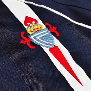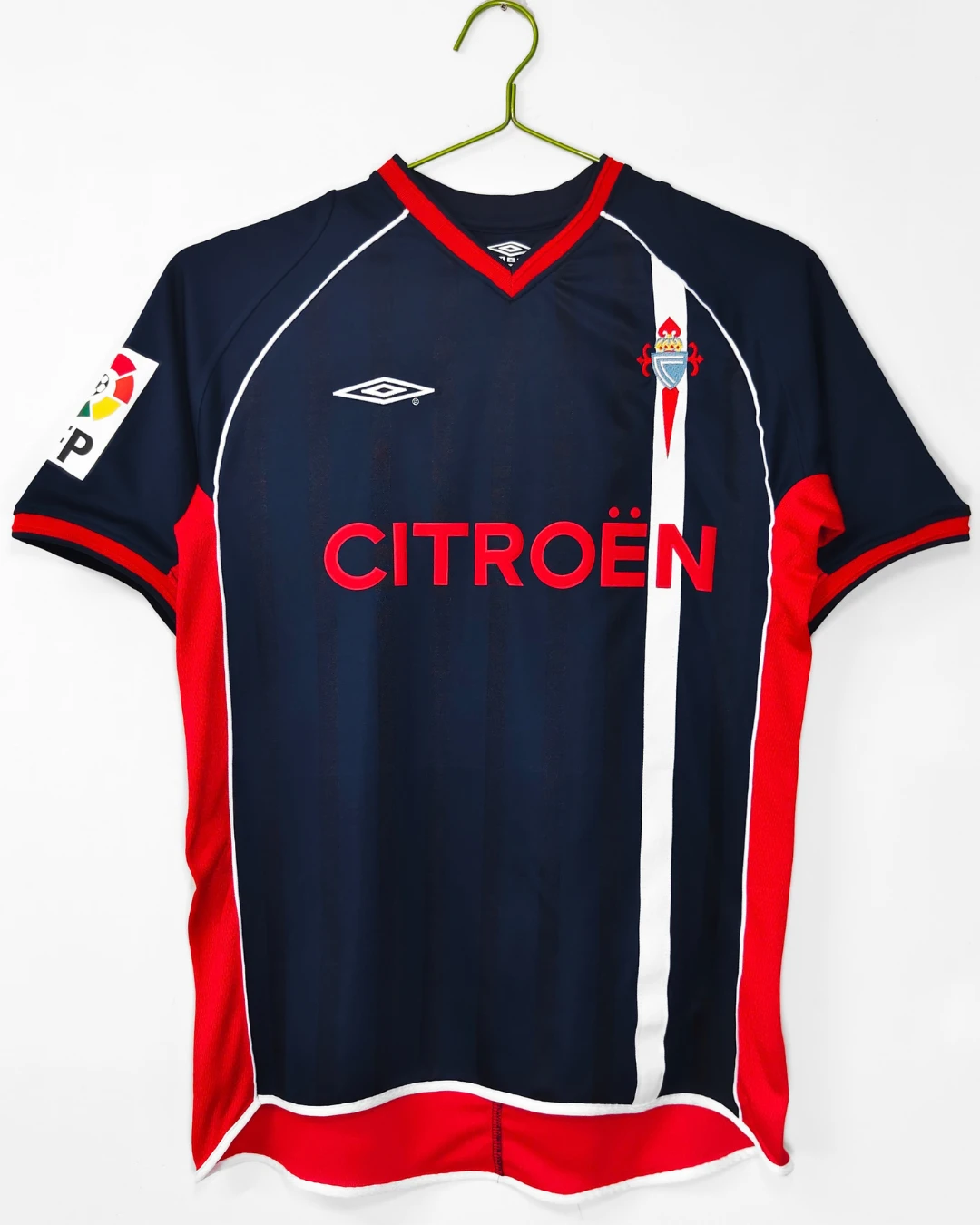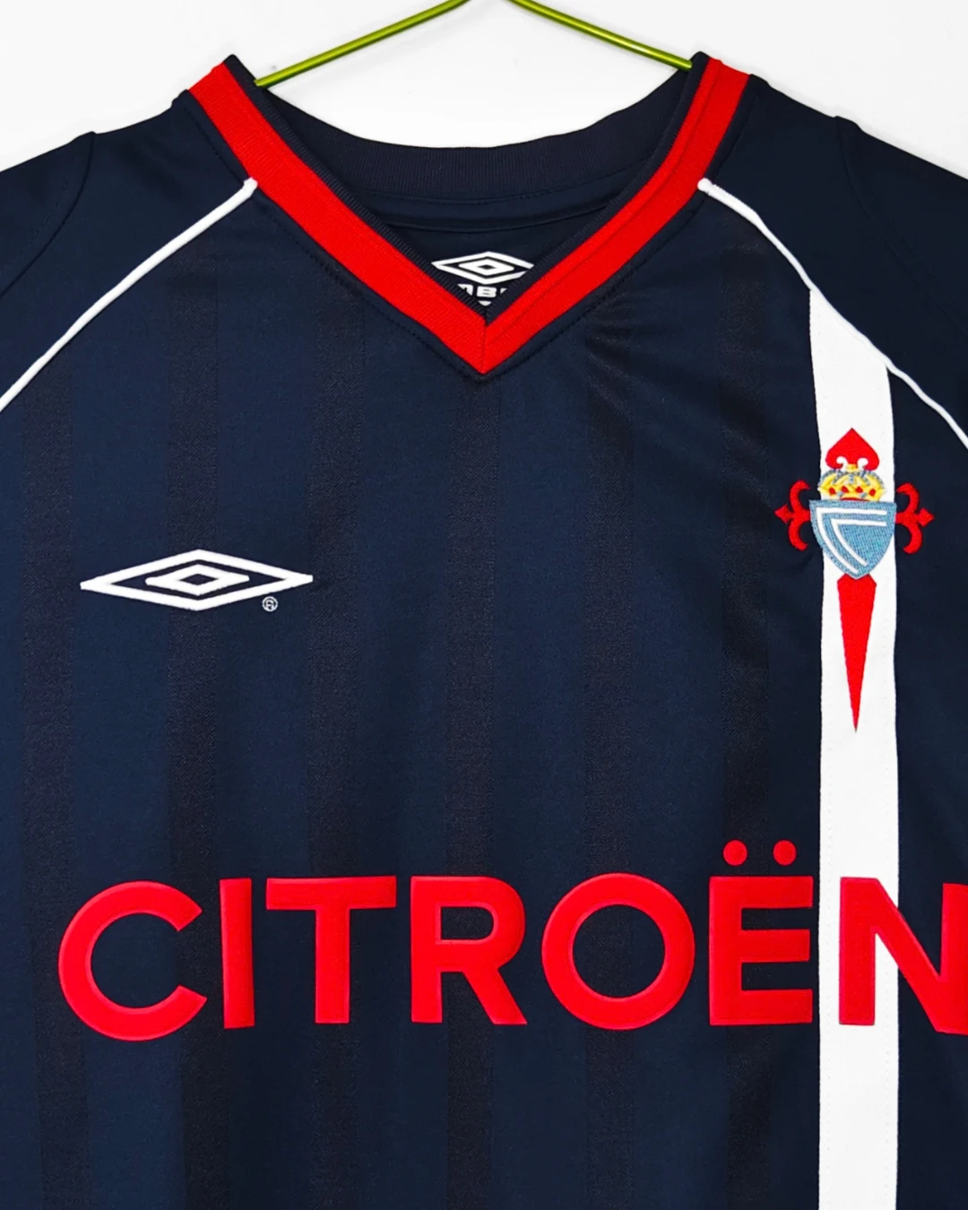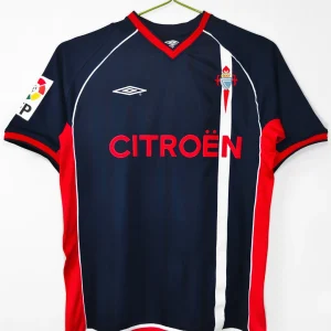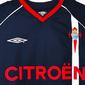 Celta Vigo’s rare 2001-2003 Third Jersey from Umbro captured their UEFA Cup semifinal run and La Liga top-half finishes, featuring a distinctive navy base with white piping and vertical stripe on the left chest symbolizing Galician maritime energy and red side panels, collar and cuff trims, prominent Citroën sponsor in red across the front, worn during their European adventure from Balaídos stadium. Perfect for young Celestes fans, this retro replica uses breathable 100% polyester knit construction, embroidered club crest with nautical anchor motif on left chest, short sleeves with red ribbed cuffs and regular relaxed fit.