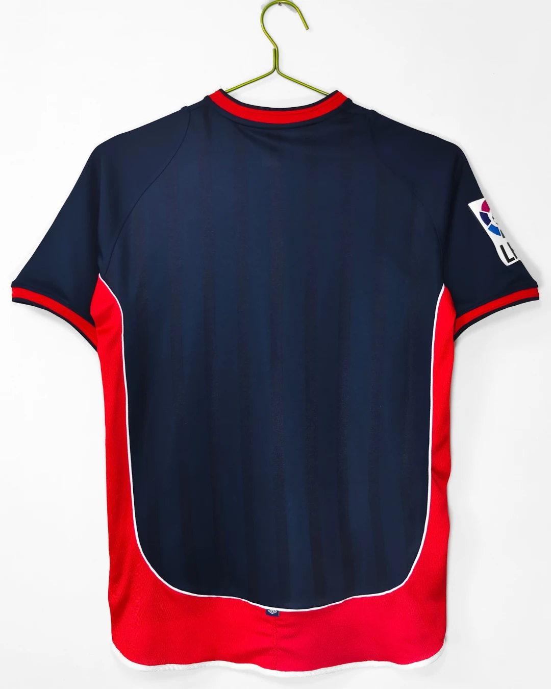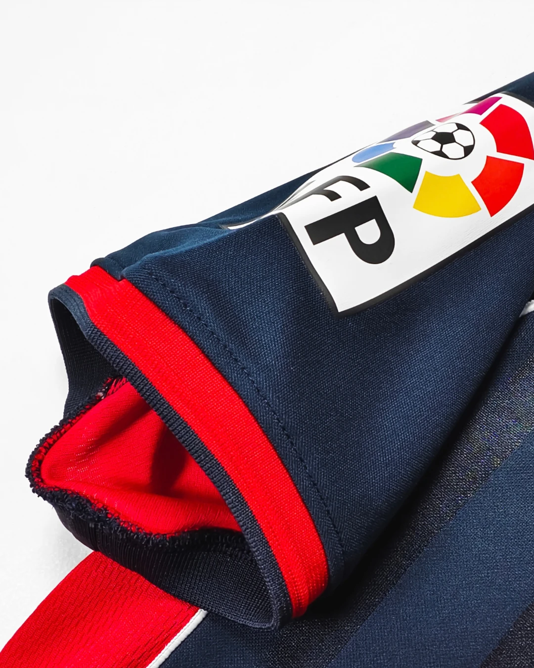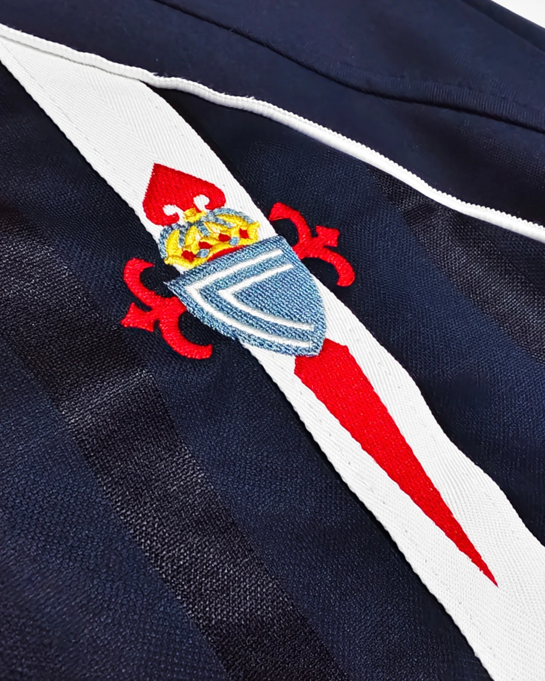 Celta Vigo’s rare 2001-2003 Third Jersey from Umbro captured their UEFA Cup semifinal run and La Liga top-half finishes, featuring a distinctive navy base with white piping and vertical stripe on the left chest symbolizing Galician maritime energy and red side panels, collar and cuff trims, prominent Citroën sponsor in red across the front, worn during their European adventure from Balaídos stadium. Perfect for young Celestes fans, this retro replica uses breathable 100% polyester knit construction, embroidered club crest with nautical anchor motif on left chest, short sleeves with red ribbed cuffs and regular relaxed fit.