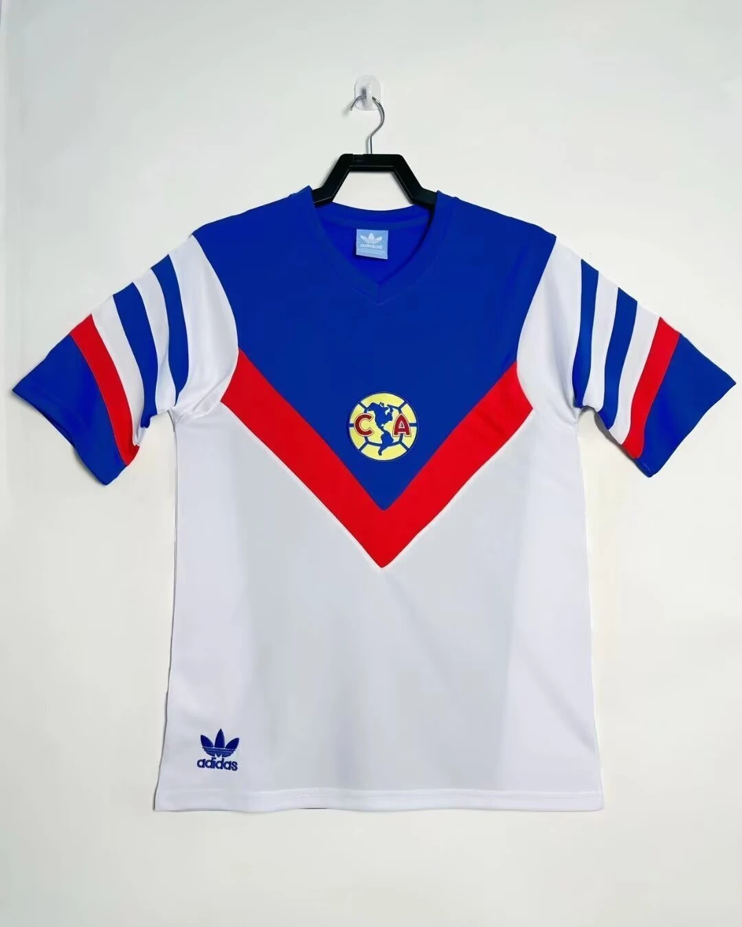 Club América’s 1986/87 Away Jersey captures a pivotal era for the Águilas, worn during their successful Liga MX campaigns under coach Miguel Ángel López, featuring stars like Carlos Reinoso, Ricardo Peláez, and goalkeeper Adrián Chávez as they defended titles at the iconic Estadio Azteca. This classic white and blue design showcases red accents, club’s crest embroidered on the center, Adidas logo on the right bottom, V-neck collar, and clean short sleeves, a timeless visitor kit embodying Mexico’s most decorated club’s dominance.