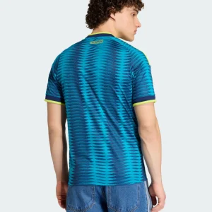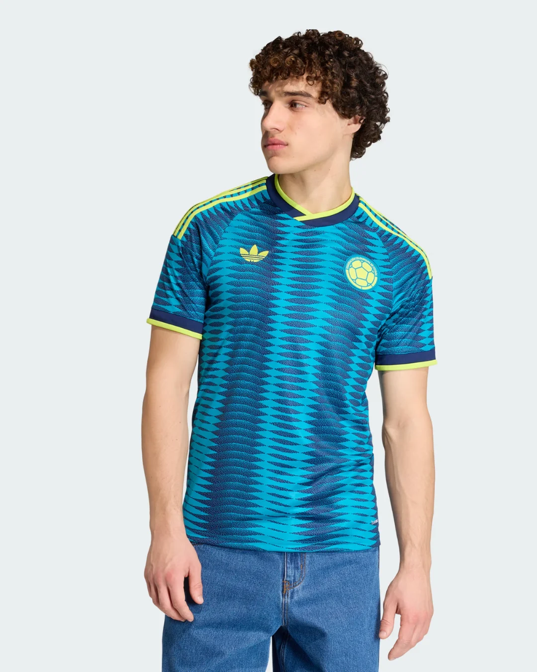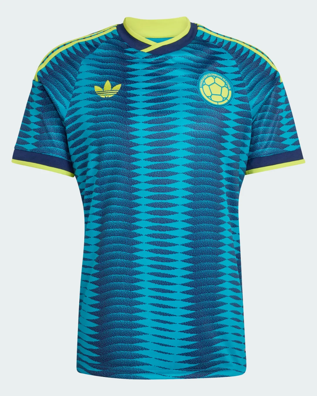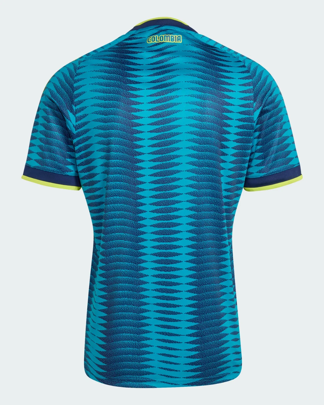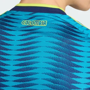 Celebrate Colombia’s coastal beauty with the Colombia 2026 WC Away Stadium Jersey from Adidas, blending Caribbean and Pacific Ocean inspiration. Deep blue base captures the nation’s dual coastlines, featuring an intricate wavy organic pattern in lighter turquoise shades symbolizing ocean currents and biodiversity, neon green accents on V-neck collar, sleeve edges, and classic Three Stripes shoulders, FCF federation badge, Adidas Trefoil logo, and slim athletic fit debuted against Croatia.