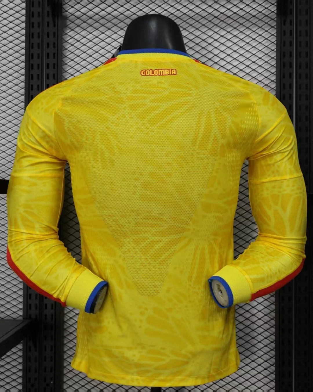 Celebrate the vibrant spirit and rich heritage of Colombian football with the Colombia 2026 World Cup Home Authentic Long Sleeve Jersey by Adidas. This jersey honors the nation’s passionate football culture and pays tribute to iconic Colombian writer Gabriel Garcia Marquez through a unique butterfly wing pattern integrated into the design, symbolizing hope, transformation, and love. The kit features a bright yellow base complemented by bold red Adidas Three Stripes along the shoulders and vibrant blue details on the collar and sleeve cuffs, representing the colors of the Colombian flag.