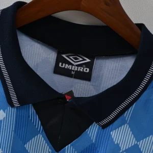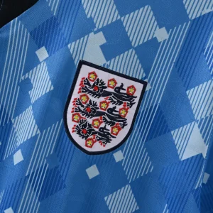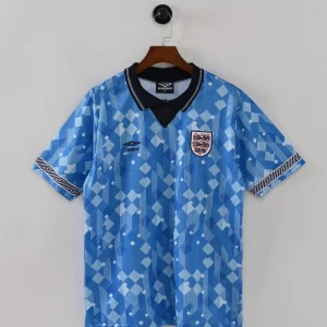 The England 1990 Third Jersey is a distinctive and iconic shirt worn by the Three Lions during the memorable 1990 FIFA World Cup campaign, a tournament etched in football history due to England’s resilience and passion. This jersey stands apart with its unique light blue design, representing a bold, alternative look that reflects the era’s emerging football culture.