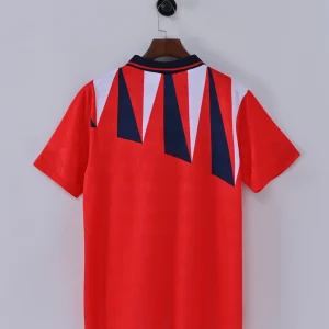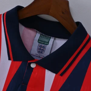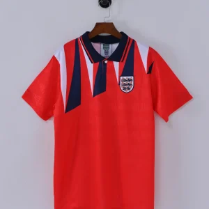 The ENGLAND 1992 AWAY JERSEY is a classic retro football shirt that embodies the traditional colors and style of the England national team from the early 1990s. Manufactured by Umbro, this iconic kit features a bold red base, representing England’s traditional away color, complemented by white and navy detailing for a clean, timeless look.