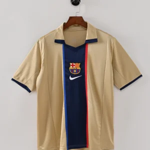 The FC Barcelona 2001/02 Away Jersey by Nike is a stylish retro classic, instantly recognized for its vibrant gold base color—a bold break from tradition that makes this shirt a fan favorite and a true collector’s piece. Worn by legends such as Rivaldo and Xavi during Barcelona’s memorable early 2000s campaigns, this kit combines sleek Nike design with Barça’s sporting heritage.