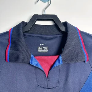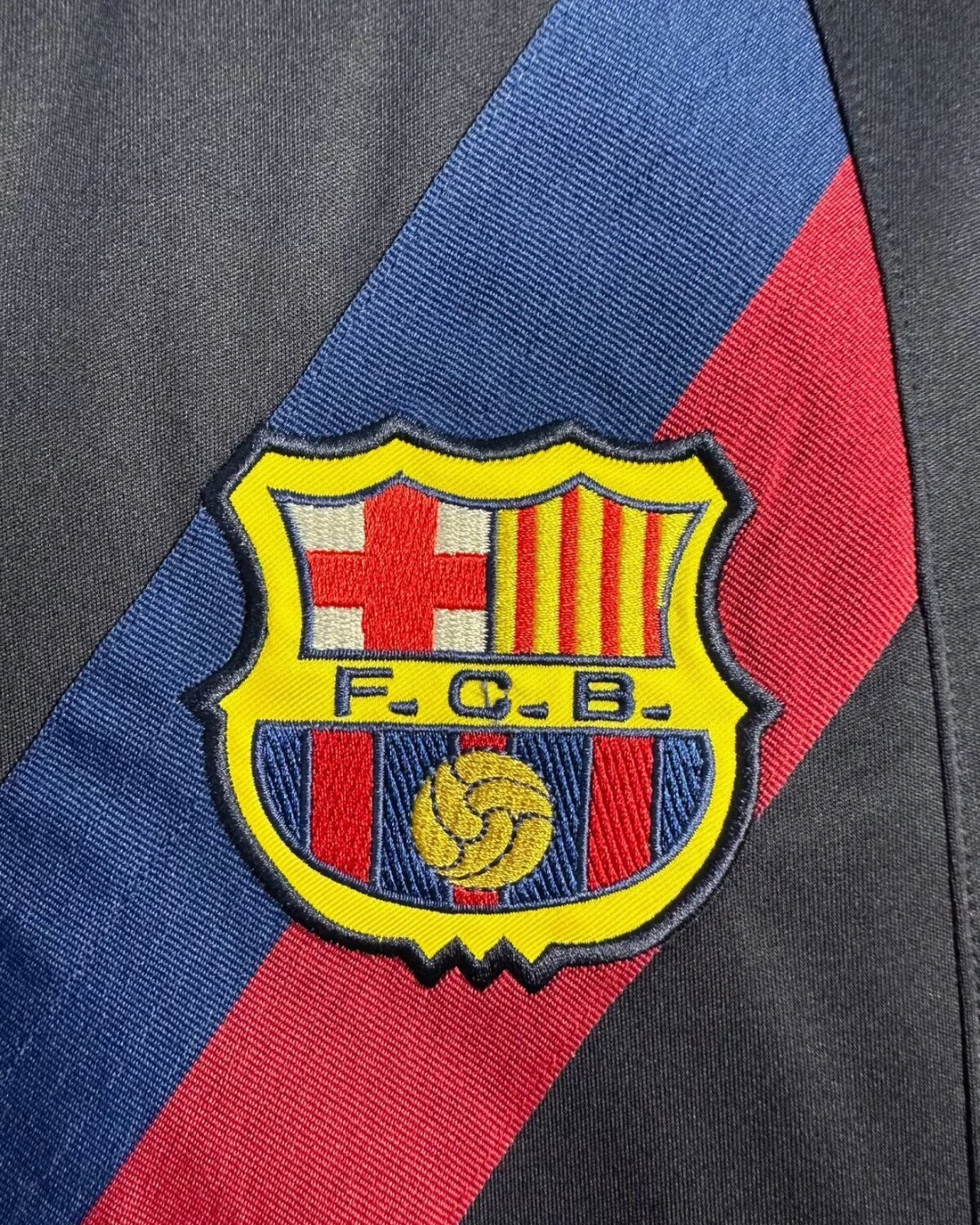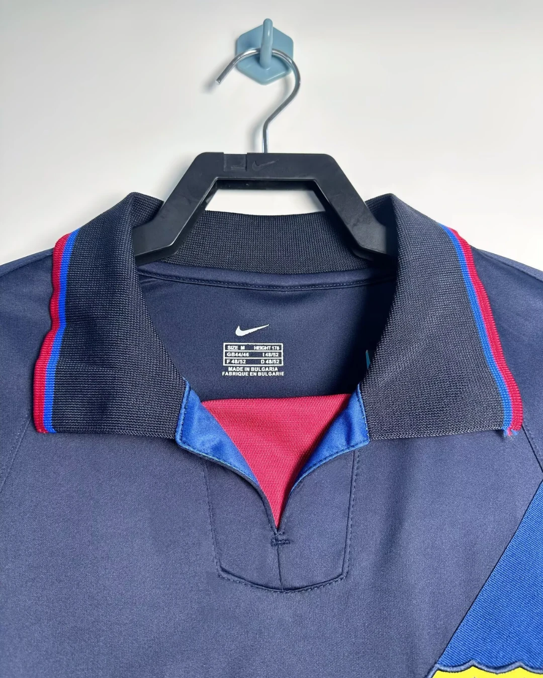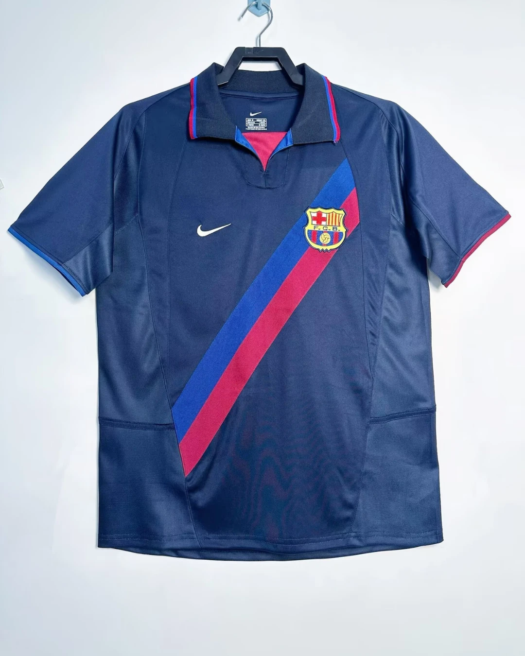 FC Barcelona’s 2002/03 Away Jersey from Nike marked their transitional La Liga season at Camp Nou, worn by Patrick Kluivert, Juan Román Riquelme, Marc Overmars, Xavi, and Javier Saviola during Louis van Gaal’s final year before Frank Rijkaard’s Blaugrana revival. The bold navy base showcases a diagonal blue and garnet sash, classic notched lapel collar in navy, embroidered FC Barcelona crest over the heart and white Nike swoosh, blending Catalan sophistication with early 2000s shine.