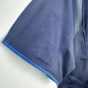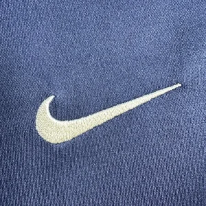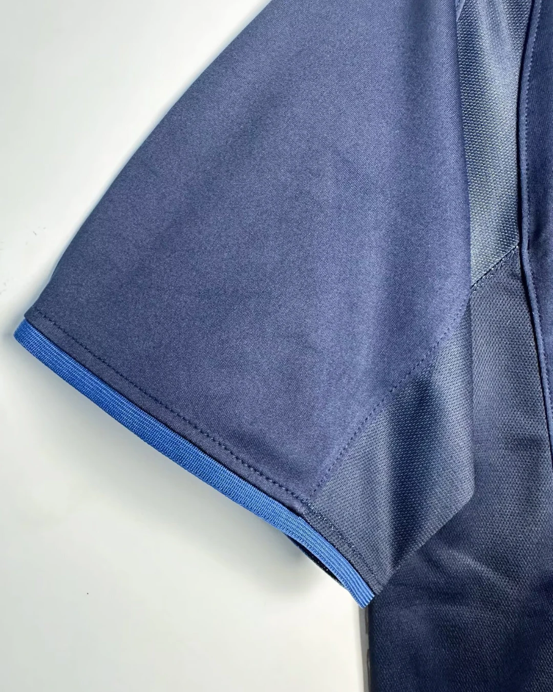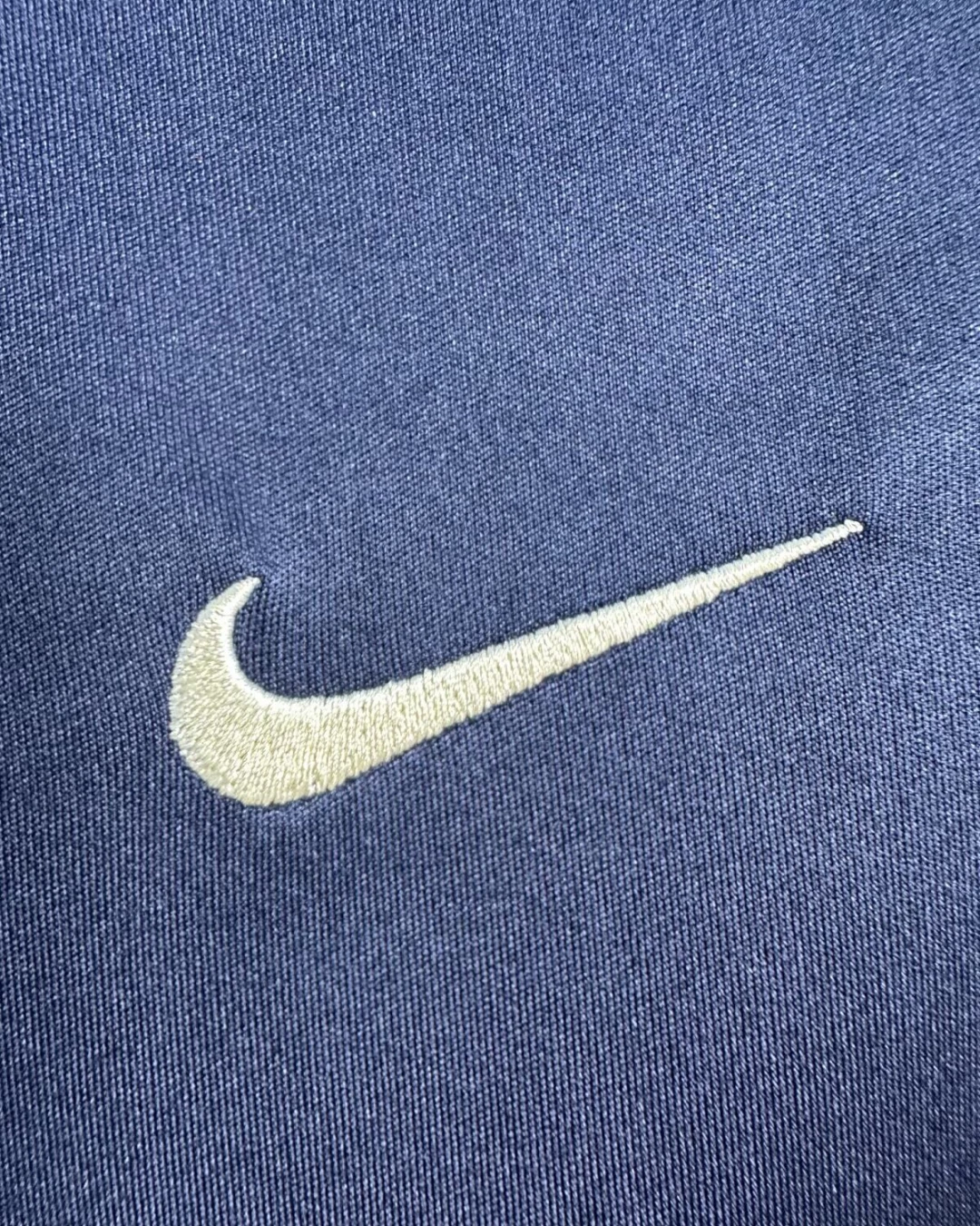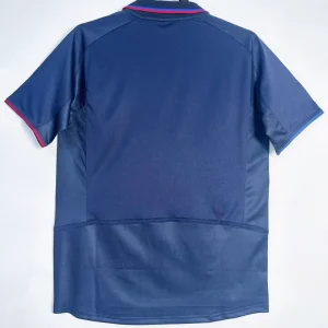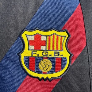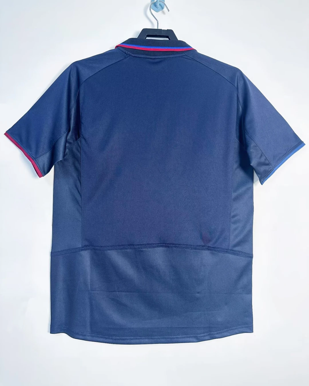 FC Barcelona’s 2002/03 Away Jersey from Nike marked their transitional La Liga season at Camp Nou, worn by Patrick Kluivert, Juan Román Riquelme, Marc Overmars, Xavi, and Javier Saviola during Louis van Gaal’s final year before Frank Rijkaard’s Blaugrana revival. The bold navy base showcases a diagonal blue and garnet sash, classic notched lapel collar in navy, embroidered FC Barcelona crest over the heart and white Nike swoosh, blending Catalan sophistication with early 2000s shine.