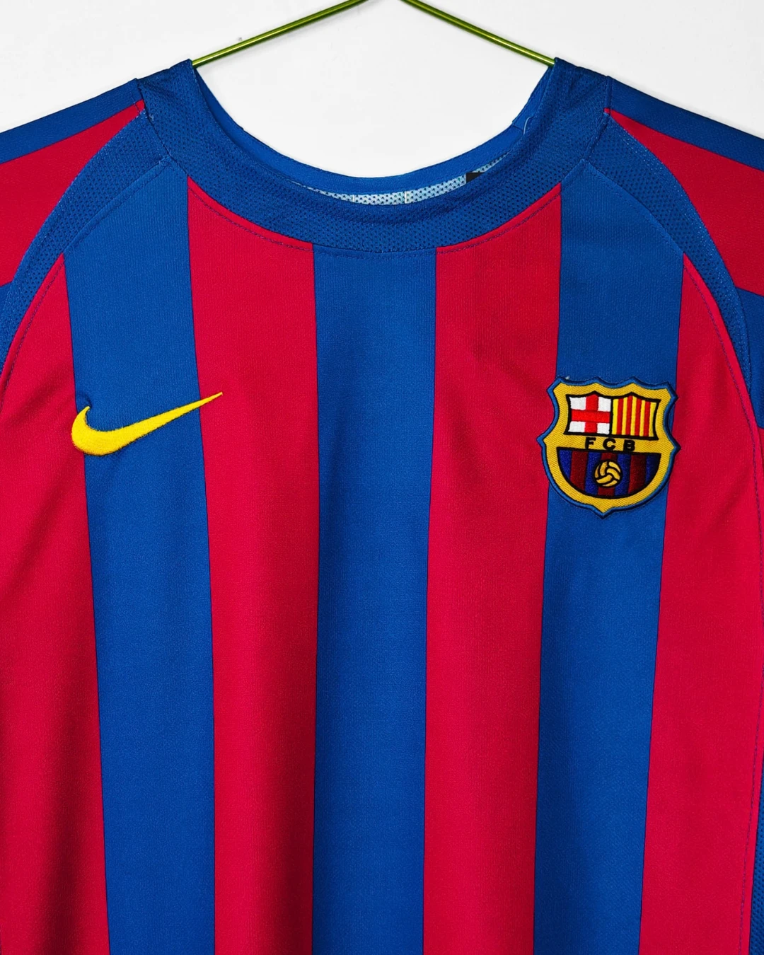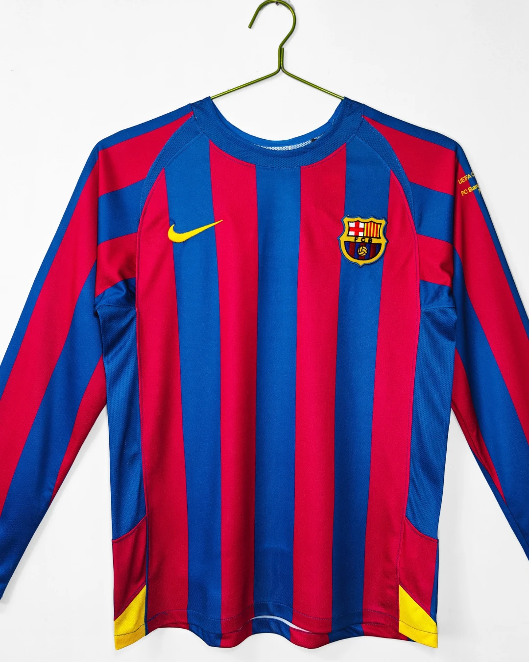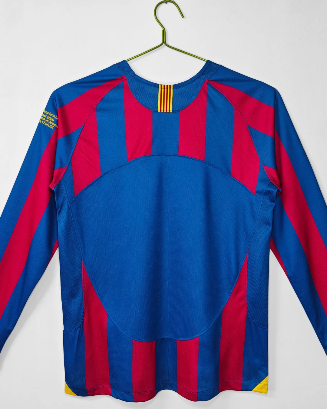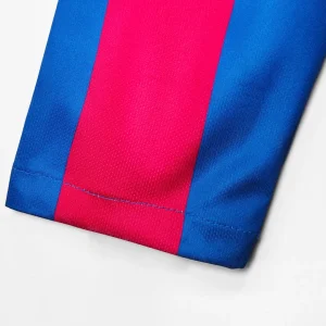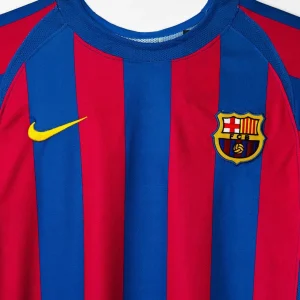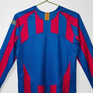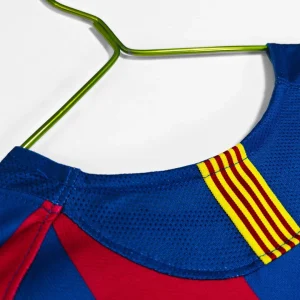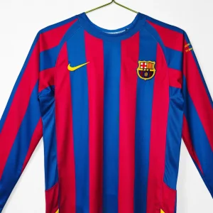 FC Barcelona’s legendary 2005/06 Home Jersey – Long Sleeve from Nike powered their Champions League triumph and La Liga title under Frank Rijkaard, featuring the classic blaugrana vertical stripes in deep blue and garnet red across a fitted long-sleeve silhouette, subtle textured sheen on the fabric, ribbed crewneck collar, Dri-FIT moisture-wicking technology for elite performance, worn during their dominant treble-chasing campaign. Perfect for young Culers, this retro long-sleeve replica uses 100% polyester construction with stretch rib cuffs for secure fit, embroidered Barça crest, Nike Swoosh and regular relaxed fit.