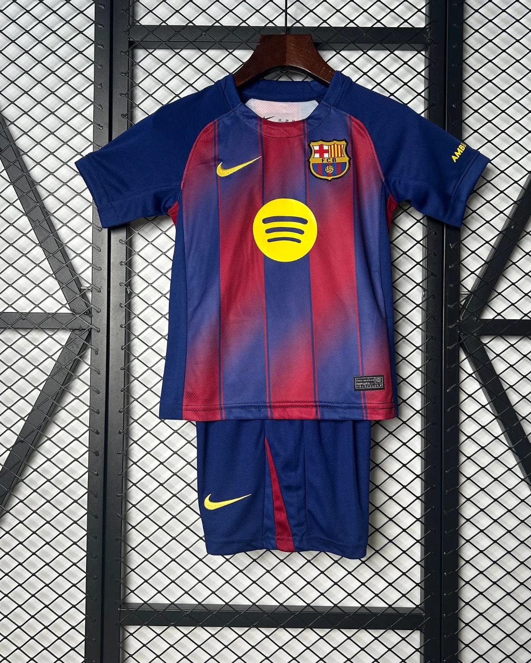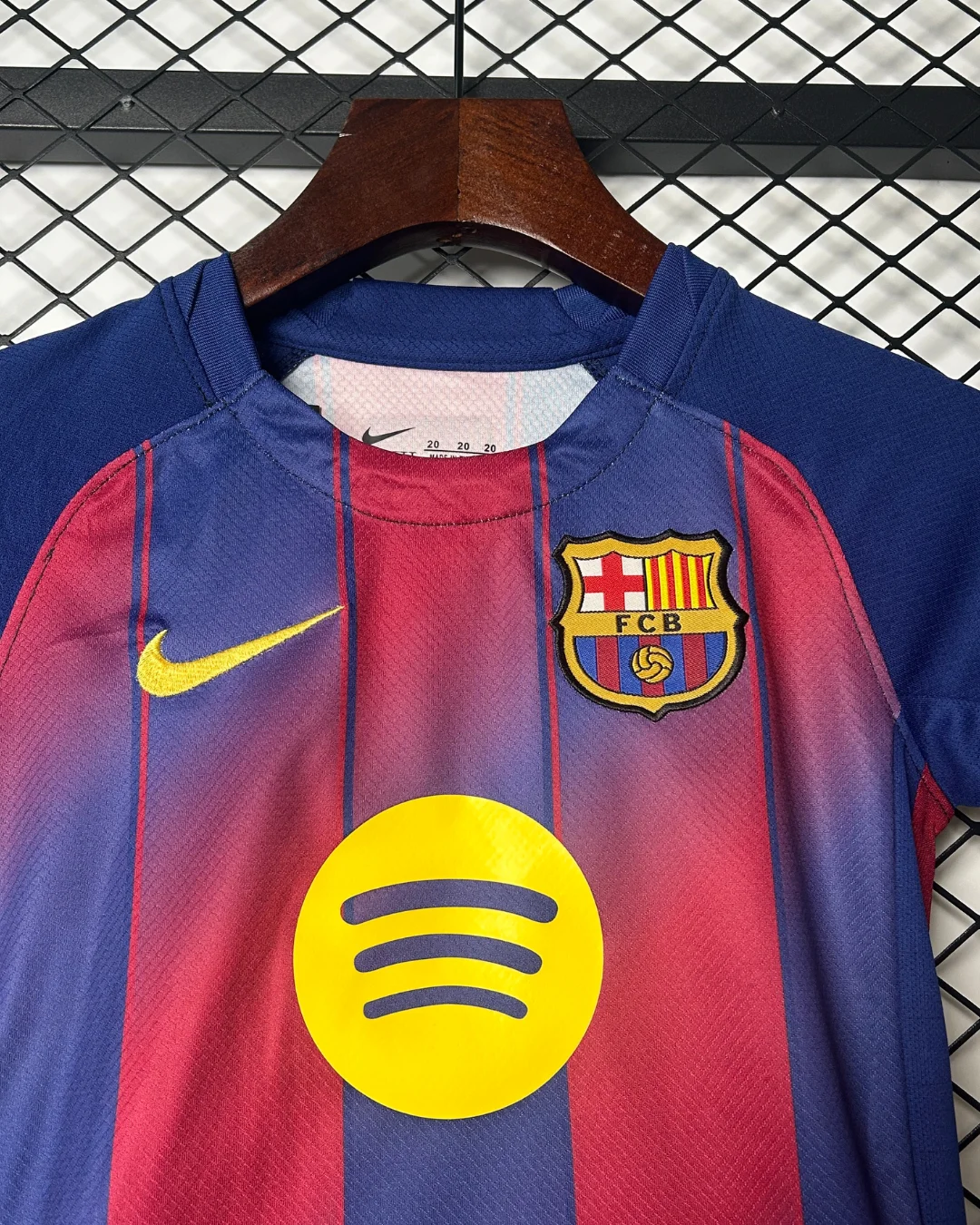 The FC Barcelona Kids 25/26 Home Kit by Nike features the traditional red and deep blue vertical stripes with a unique gradient effect blending the colors toward the center of the shirt, creating a modern and dynamic look. All logos on the jersey are in yellow, replacing the gold from the previous season, and a small flag combining the club’s colors with the Catalan flag is placed on the upper back.