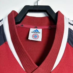 FC Bayern Munich’s classic 2001/02 Home Jersey from Adidas powered their Champions League quarterfinal campaign and Bundesliga title challenge at the Olympiastadion, worn by stars Oliver Kahn, Giovane Élber, Michael Ballack, Stefan Effenberg, and Mehmet Scholl during Ottmar Hitzfeld’s competitive season. The timeless red base features navy sleeves, white V-neck collar and shoulder stripes, embroidered Bavarian crown crest on left chest, Adidas logo opposite, and prominent “Opel” sponsor, quintessential Bayern design returning to traditional roots after experimental 90s kits.