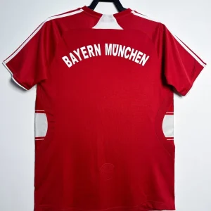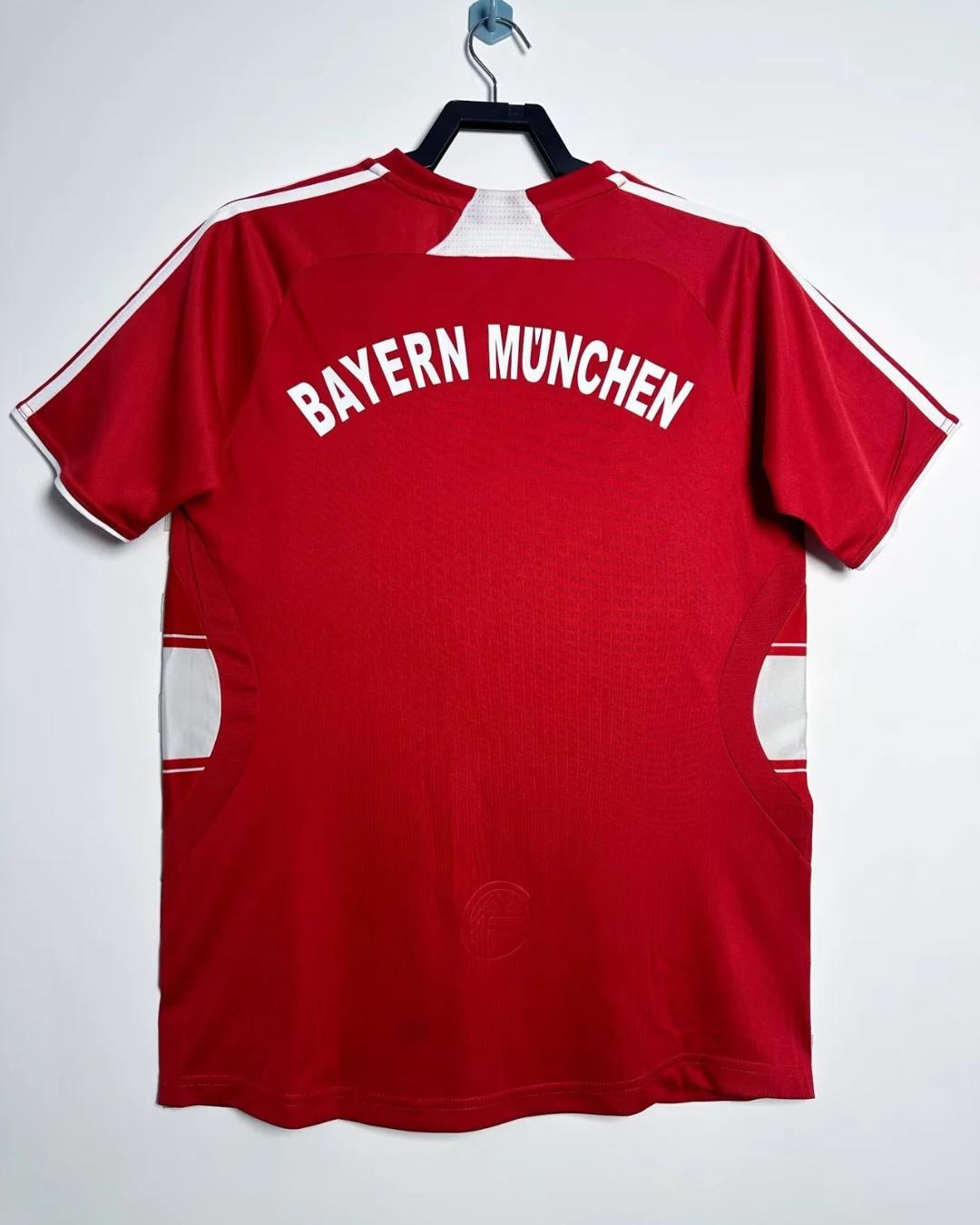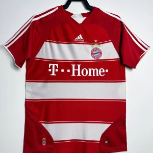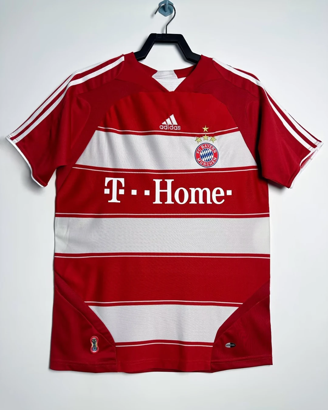 FC Bayern Munich’s 2007/08 Home Jersey from Adidas powered Ottmar Hitzfeld’s Bundesliga and DFB-Pokal double-winning campaign at the Allianz Arena, worn by stars like Miroslav Klose, Franck Ribéry, Luca Toni, and Mark van Bommel during their dominant domestic conquest. The striking red base with white hoop design features a clean crew neck collar, embroidered Bavarian crown crest on left chest, Adidas logo on the center, and prominent “Deutsche Telekom” sponsor across the front, classic Mia san Mia styling blending tradition with late-2000s sophistication.