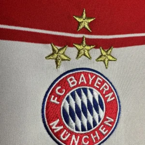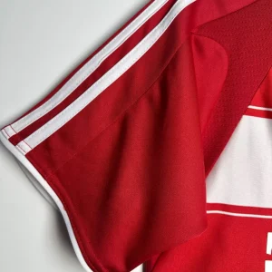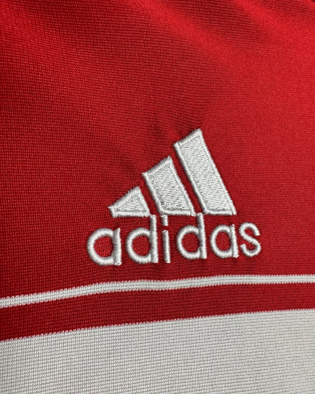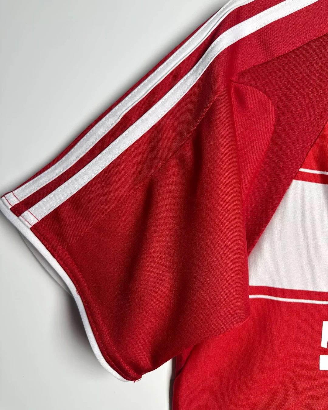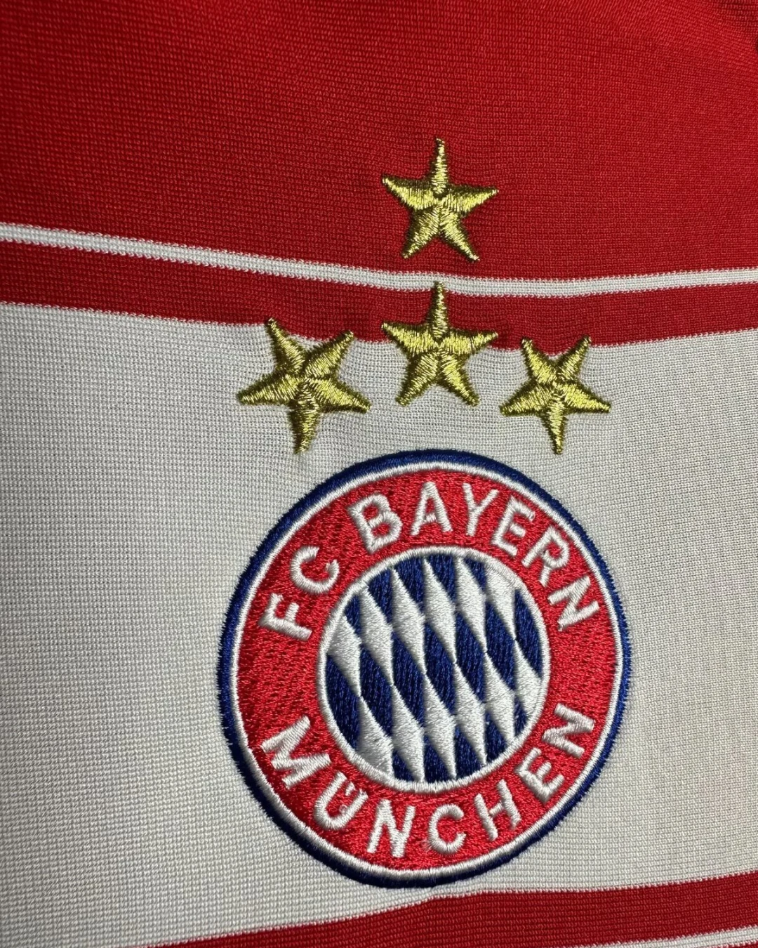 FC Bayern Munich’s 2007/08 Home Jersey from Adidas powered Ottmar Hitzfeld’s Bundesliga and DFB-Pokal double-winning campaign at the Allianz Arena, worn by stars like Miroslav Klose, Franck Ribéry, Luca Toni, and Mark van Bommel during their dominant domestic conquest. The striking red base with white hoop design features a clean crew neck collar, embroidered Bavarian crown crest on left chest, Adidas logo on the center, and prominent “Deutsche Telekom” sponsor across the front, classic Mia san Mia styling blending tradition with late-2000s sophistication.